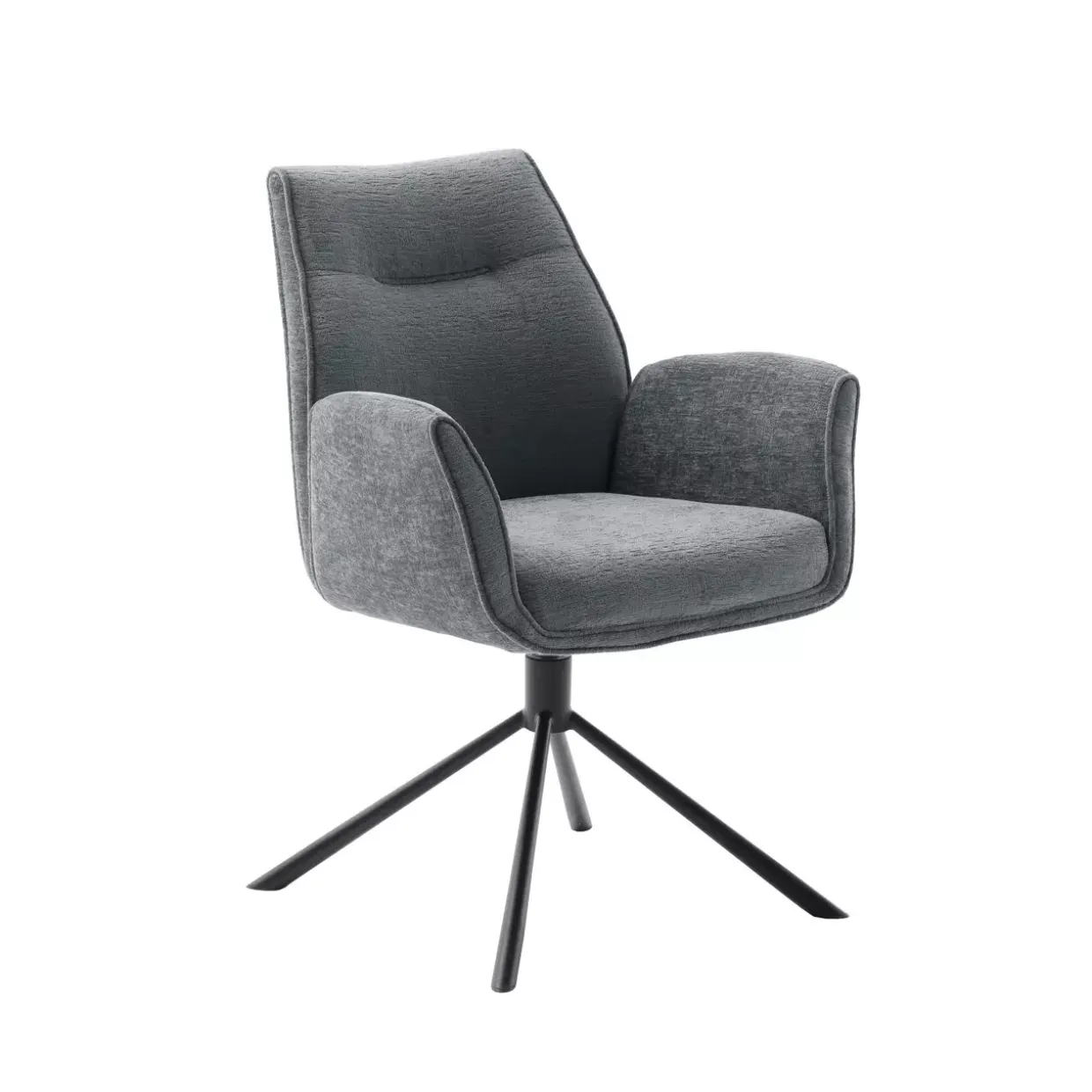 DIVERIA 4 Fuß Stuhl mit ArmlehnenEin luxuriöser Sitzkomfort wird durch den Taschenfederkern geboten, der in diesem eleganten Stuhl integriert ist. Das konische, runde Gestell aus robustem Stahl verleiht dem Möbelstück nicht nur Stabilität, sondern auch eine zeitlose Ästhetik. In den Farben Anthrazit und Schwarz Matt fügt sich dieser Stuhl nahtlos in verschiedene Wohnstile ein und setzt stilvolle Akzente. Die Kombination aus Metall und Chenille-Textil sorgt für eine harmonische Mischung aus Haltbarkeit und Komfort. Hochwertige Synthetikfasern in der Textilart garantieren Langlebigkeit und Pflegeleichtigkeit. Eine Schaumstofffüllung unterstützt den Sitzaufbau und bietet zusätzlichen Komfort, während die lackierte Oberfläche für einen edlen Glanz sorgt.Besonderen Komfort bietet die 360-Grad-Drehbarkeit mit intelligenter Nivellierung, die Flexibilität und Bewegungsfreiheit ermöglicht. Die Armlehnen laden dazu ein, sich entspannt zurückzulehnen und die Momente der Ruhe zu genießen. Ein konventioneller Stil trifft auf moderne Funktionalität und macht diesen Stuhl zu einem vielseitigen Möbelstück, das sowohl in Privaträumen als auch in Büros eine ausgezeichnete Figur macht. Durch die sorgfältige Auswahl der Materialien und das durchdachte Design wird dieser Stuhl zu einem Highlight in jedem Raum.