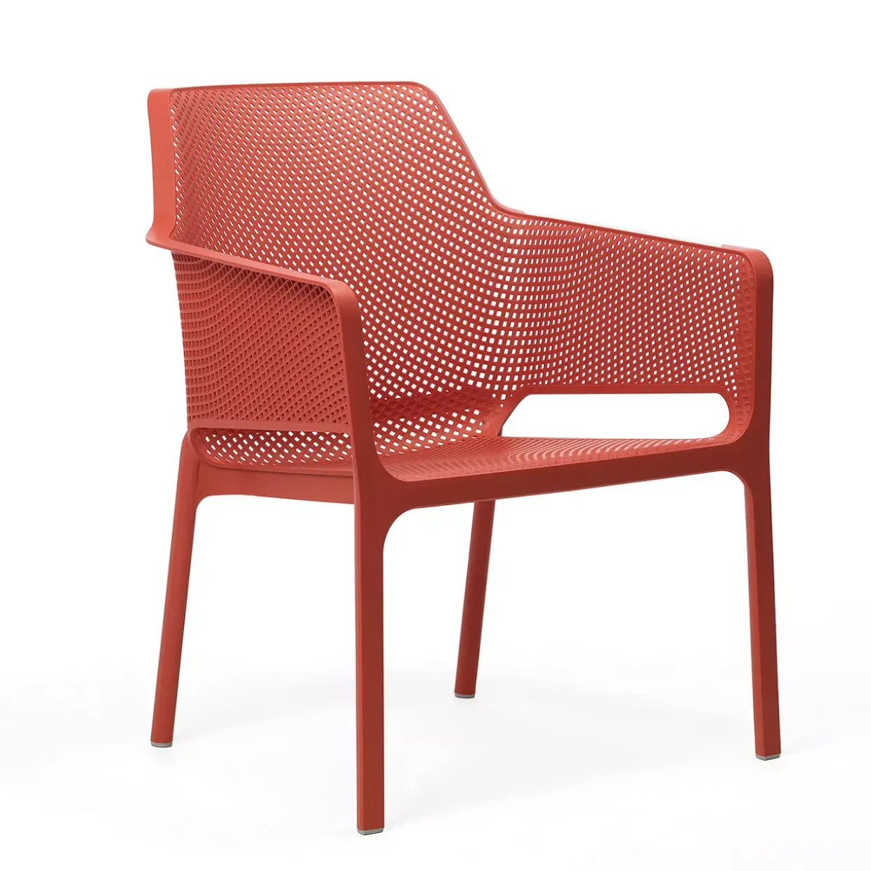 Polypropylen in der Farbe Corallo verleiht dem Net Armlehnenstuhl eine lebendige und dennoch elegante Ausstrahlung. Die moderne Gestaltung dieses Stuhls fügt sich nahtlos in verschiedene Innen- und Außenbereiche ein. Sein Design ist nicht nur zeitgemäß, sondern auch äußerst funktional.
