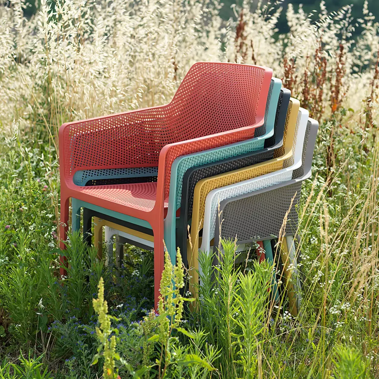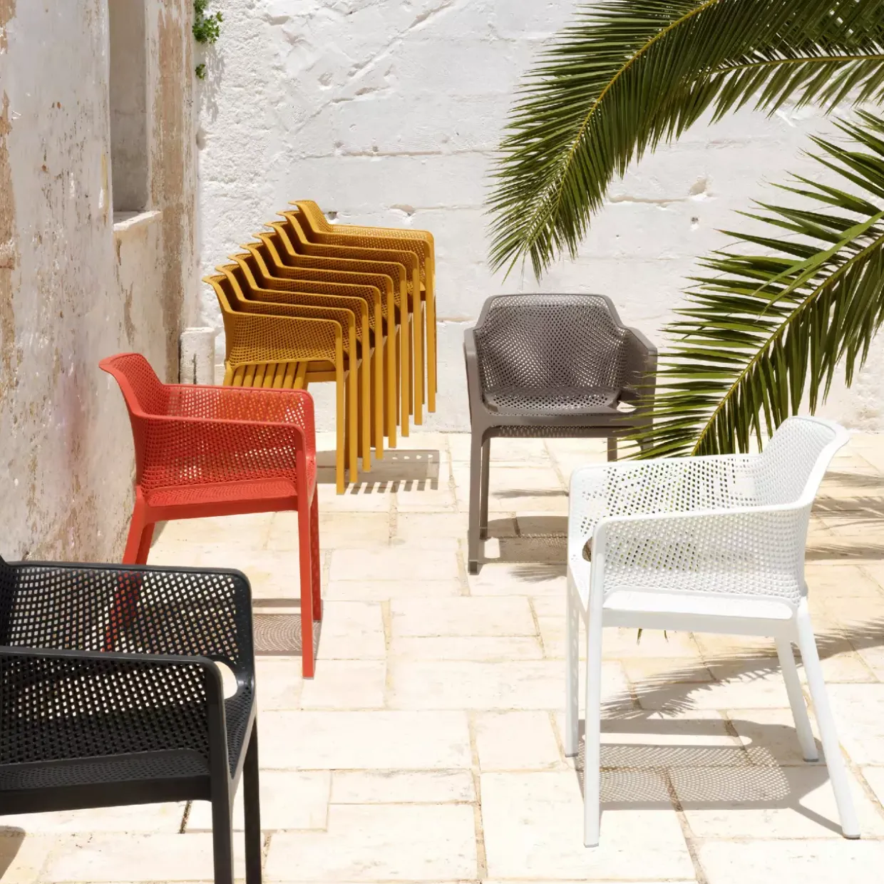 Der Net Armlehnenstuhl besteht aus hochwertigem Kunststoff, der für seine Langlebigkeit und Beständigkeit bekannt ist. Dieses Material bietet den Vorteil, dass es leicht zu reinigen und wetterbeständig ist, was den Stuhl ideal für den Einsatz im Freien macht. Egal, ob auf der Terrasse oder im Esszimmer, er ist vielseitig einsetzbar und fügt jedem Raum eine stilvolle Note hinzu.
