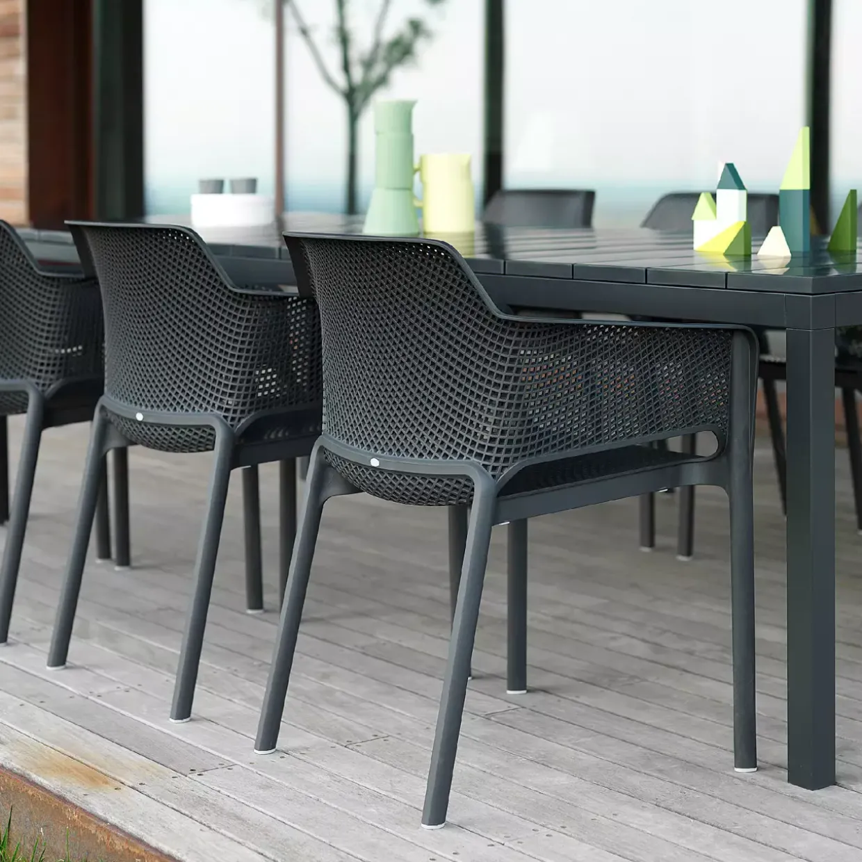 Ein Hauch von Modernität prägt den Armlehnenstuhl Net. Mit seiner eleganten Form und der subtilen Farbe Anthrazit fügt er sich nahtlos in zeitgemäße Wohnräume ein. Der Stuhl besteht aus robustem Kunststoff, genauer gesagt aus Polypropylen, das für seine Langlebigkeit und Widerstandsfähigkeit bekannt ist.