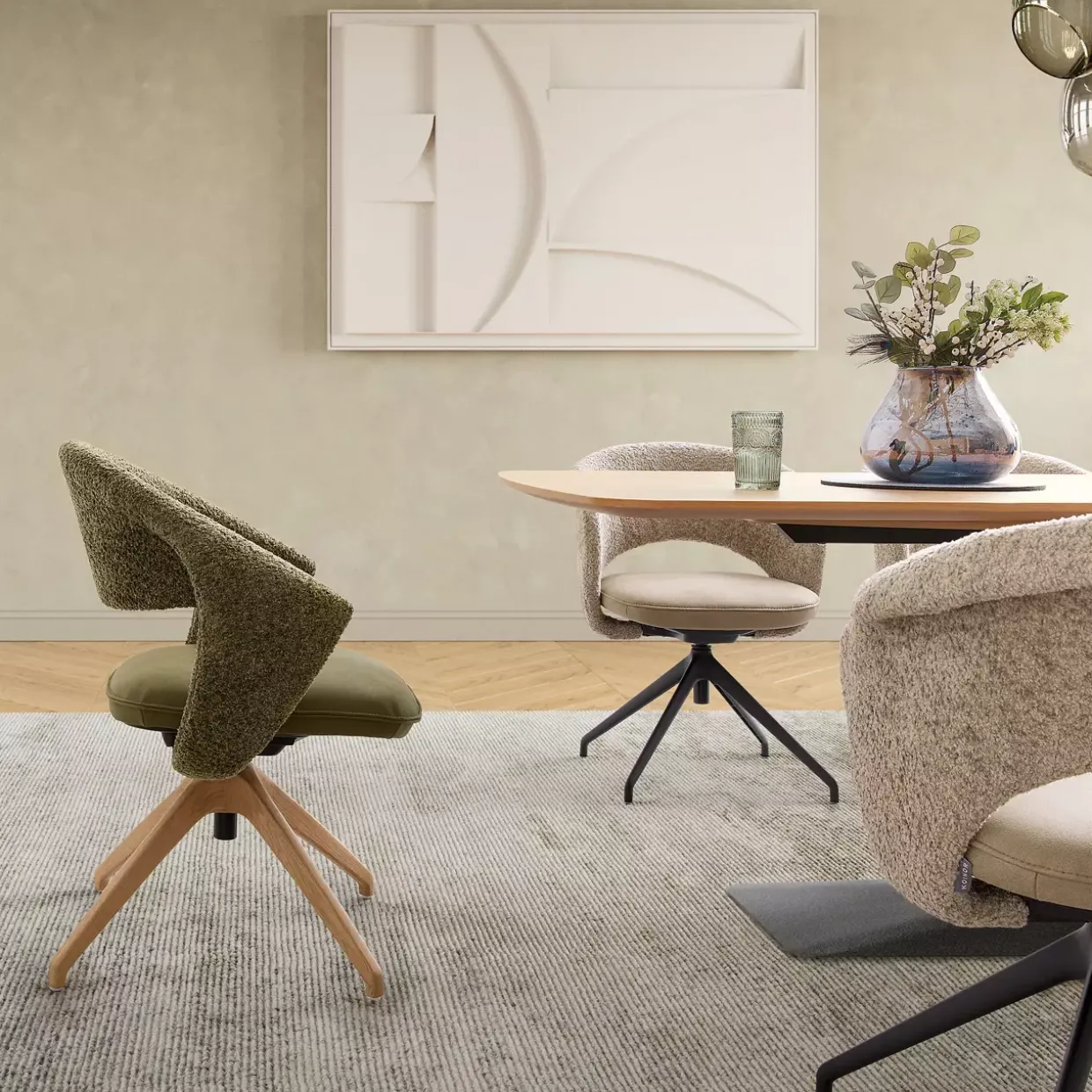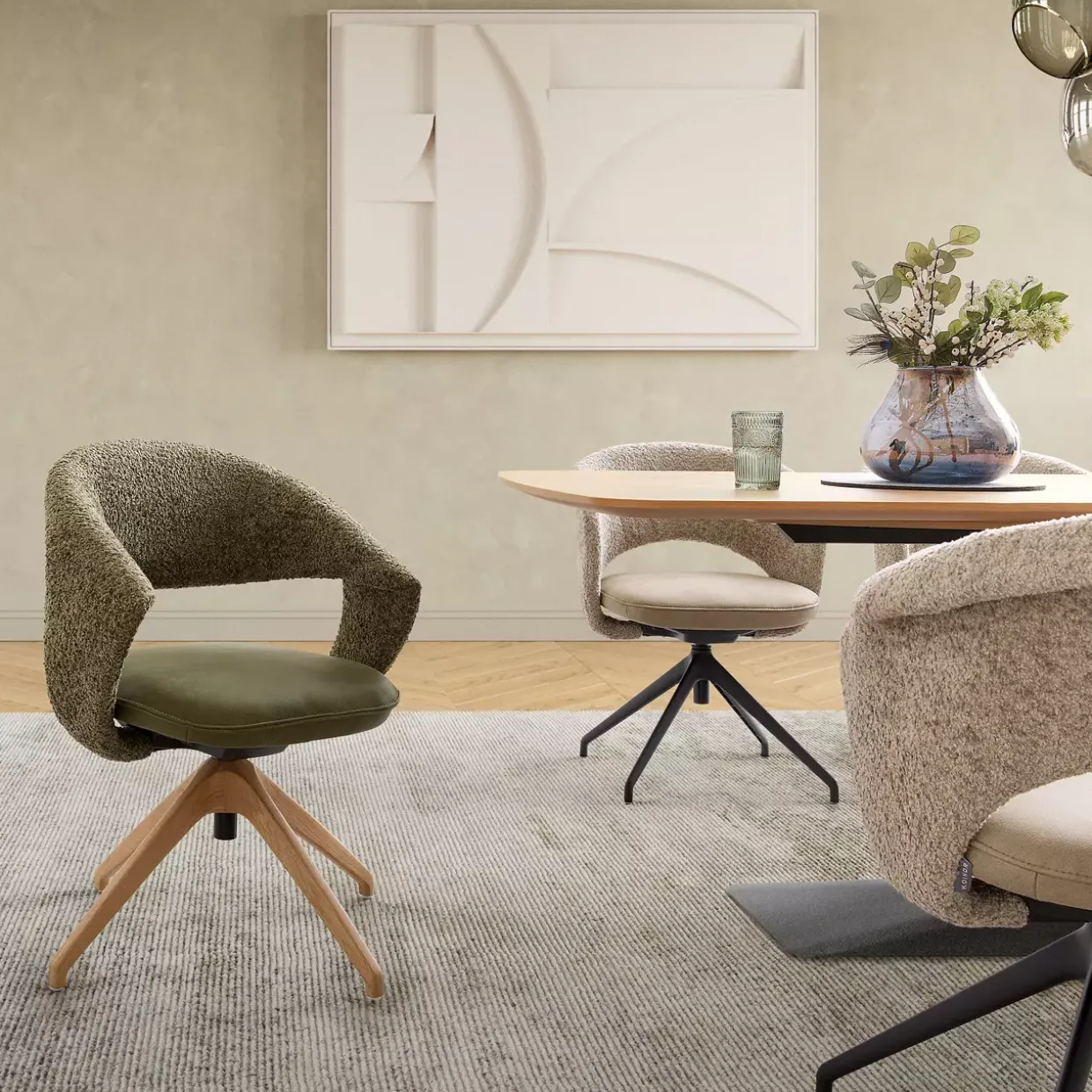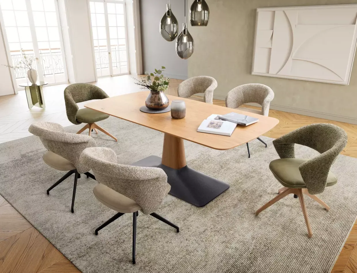 Eine weitere Besonderheit ist die 360-Grad-Drehfunktion, die nicht nur Komfort bietet, sondern auch Flexibilität in der Nutzung ermöglicht. Das Stativgestell aus hochwertigem Wildeichenholz sorgt für Stabilität und verleiht dem Stuhl eine markante Silhouette. Die legere Polsterung kombiniert Diolenwatte und Formschaum, was für ein angenehmes Sitzgefühl sorgt.