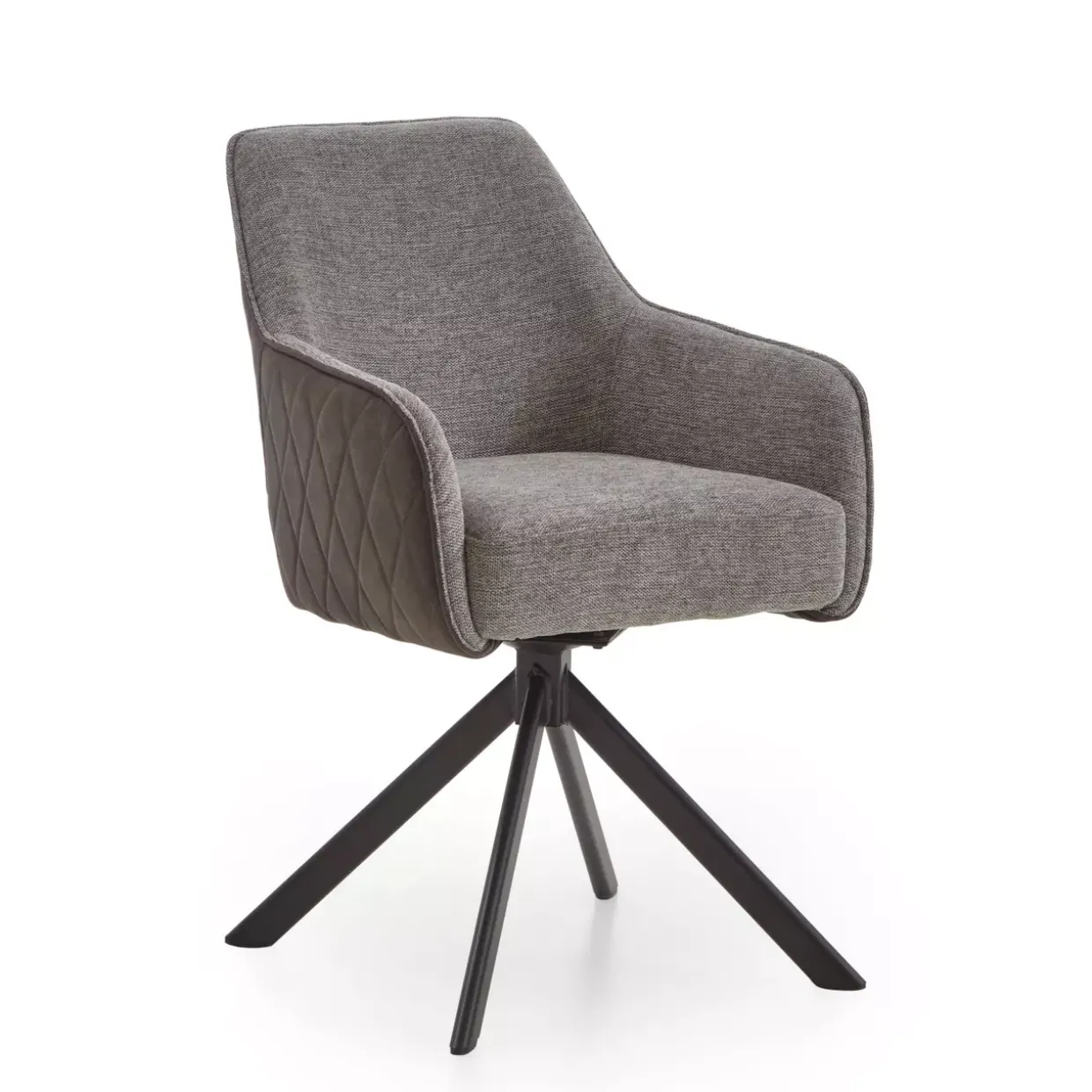 Ein Highlight des modernen Armlehnstuhls ist die elegante Diadem-Steppung, die dem Design eine besondere Note verleiht. Der Stuhl strahlt in einem zeitlosen Grau-Schwarz und passt perfekt in jedes stilbewusste Ambiente. Die Kombination aus hochwertigem Stoff und robustem Eisen sorgt für Langlebigkeit und Stabilität.