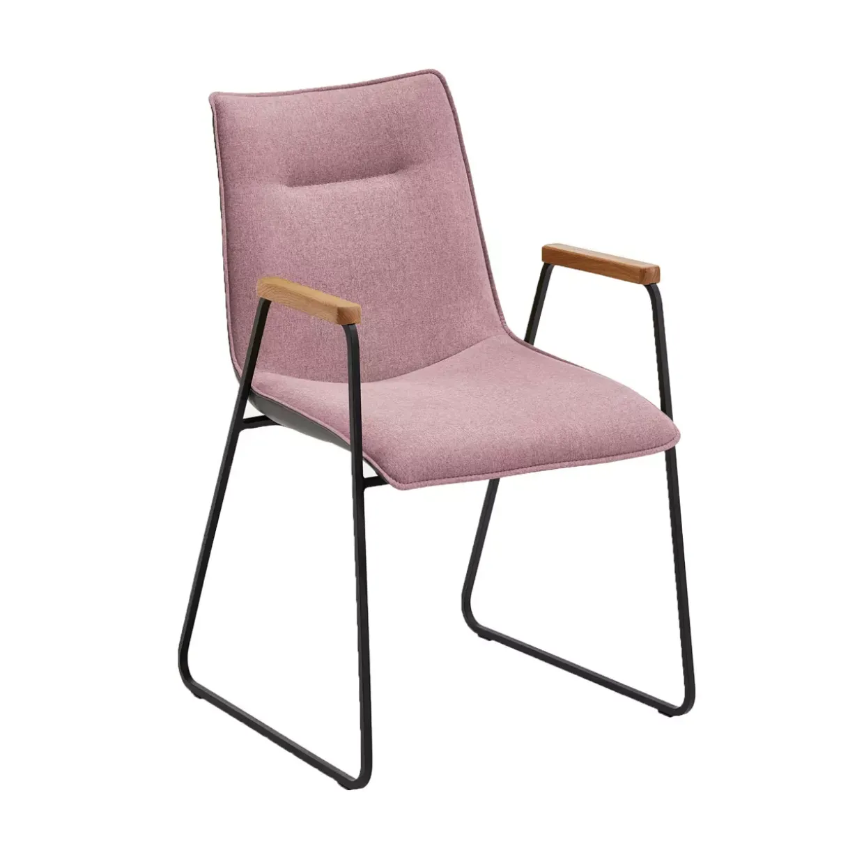 Besonders erwähnenswert sind die Armlehnen, die sowohl für zusätzlichen Komfort sorgen als auch die Formvollendung des Designs darstellen. Der in Eisen schwarz gehaltene Rahmen kontrastiert harmonisch mit den restlichen Materialien und Farben, wodurch ein stimmiges Gesamtbild entsteht.