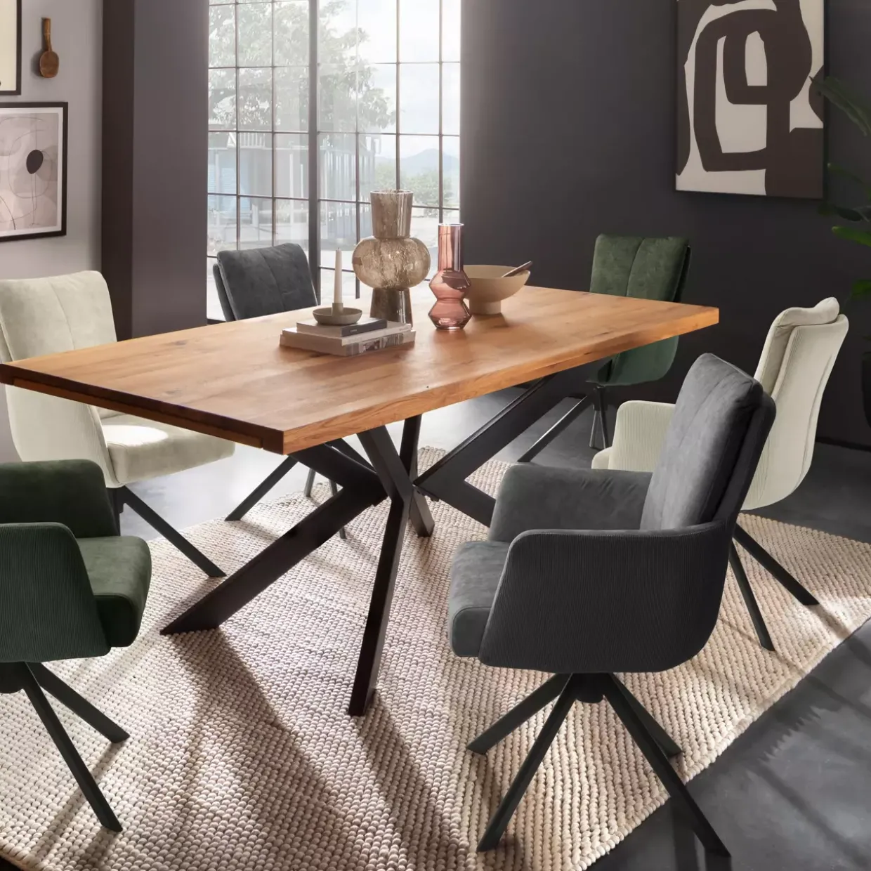 ROSARIO 4 Fuß Stuhl mit Armlehnen Exklusiv BegrosEin luxuriöser Taschenfederkern sorgt im modernen Stuhl mit Armlehnen für einen außergewöhnlichen Komfort. Die Kombination aus Vintage-Veloursoptik innen und Cord-Optik außen verleiht dem Design eine besondere Eleganz. Durch die 360°-Drehfunktion mit Nivellierung sind Flexibilität und Anpassungsfähigkeit garantiert. Metall und Textil vereinen sich in diesem Stuhl, wobei Polyester als Textilart für Langlebigkeit sorgt. Die Schaumstofffüllung, ergänzt durch den Taschenfederkern, bietet einen hervorragenden Sitzkomfort, der stundenlanges Verweilen ermöglicht. Das schwarz matt lackierte 4-Fußgestell aus Metall verleiht dem Stuhl Stabilität und eine edle Optik. Die Oberfläche, ebenfalls lackiert, bietet eine angenehme Haptik und ist pflegeleicht. Für Menschen, die Stil und Bequemlichkeit in ihren Wohnraum integrieren möchten, könnte dieser Stuhl eine ideale Wahl sein. Die moderne Gestaltung fügt sich harmonisch in verschiedene Einrichtungsstile ein und setzt gleichzeitig Akzente. Ein Stuhl, der nicht nur durch sein Design, sondern auch durch seine Funktionalität überzeugt, um den Alltag komfortabler zu gestalten. Die hochwertige Verarbeitung und die durchdachten Details machen ihn zu einem wertvollen Begleiter in jedem Zuhause.