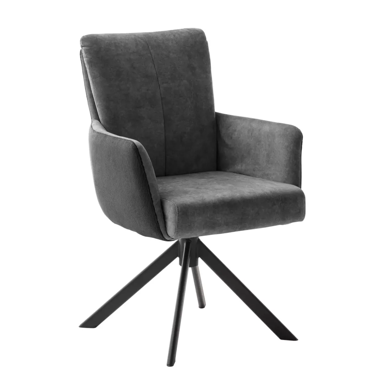 ROSARIO 4 Fuß Stuhl mit Armlehnen Exklusiv BegrosTaschenfederkern trifft auf Luxus-Komfort: Dieser moderne Stuhl mit Armlehnen vereint stilvolle Eleganz mit durchdachter Funktionalität. Die Kombination aus einer Vintage-Veloursoptik im Inneren und einer Cord-Optik im Außenbereich verleiht dem Stuhl ein zeitloses Design, das sowohl in moderne als auch klassische Wohnräume passt. Ein matt lackiertes Metallgestell sorgt für Stabilität und Langlebigkeit, während die anthrazitfarbenen Töne eine harmonische Verbindung schaffen. Die 360°-Drehbarkeit des Stuhls mit Nivellierung ermöglicht Ihnen Flexibilität und Komfort in jeder Situation. Der Sitzaufbau aus Schaumstofffüllung und Taschenfederkern sorgt für eine besonders angenehme Sitzqualität, die durch die Polsterung aus hochwertigem Polyester zusätzlich unterstrichen wird. Diese Materialwahl bietet nicht nur ein angenehmes Sitzgefühl, sondern auch eine hohe Strapazierfähigkeit. Ein 4-Fußgestell verleiht dem Stuhl eine elegante Silhouette und gewährleistet gleichzeitig Stabilität auf verschiedenen Bodenbelägen. Der Stuhl ist somit nicht nur ein ästhetisches Highlight, sondern auch ein funktionales Möbelstück, das Komfort und Stil in Einklang bringt. Ob im Esszimmer oder im Büro, dieser Stuhl verspricht ein komfortables Sitzerlebnis für anspruchsvolle Nutzer, die Wert auf Qualität und Design legen.