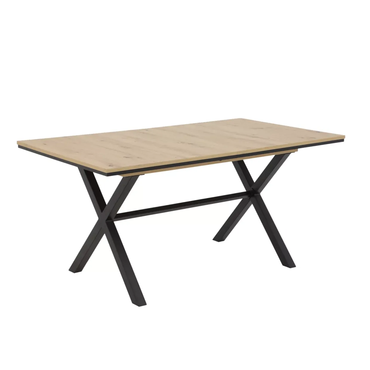 Ein stilvolles Design in Schwarz kombiniert mit einer Oberfläche in Artisan Eiche Nachbildung verleiht jedem Raum eine elegante Note. Die harmonische Verbindung aus Holzwerkstoff und Metall sorgt für Stabilität und eine ansprechende Optik. Besonders markant ist die X-förmige Fußkonstruktion, die dem Tisch einen modernen und zugleich stabilen Stand verleiht.