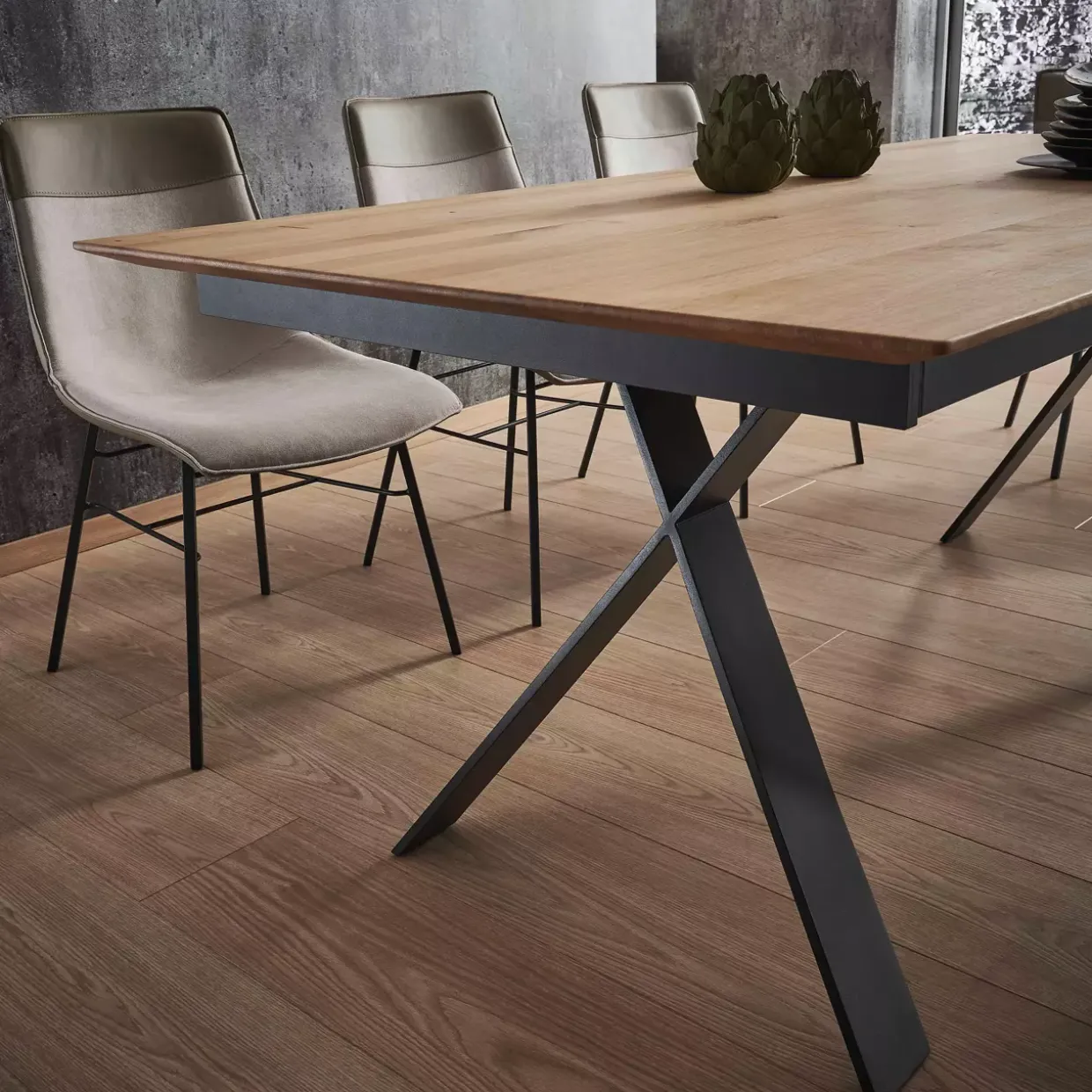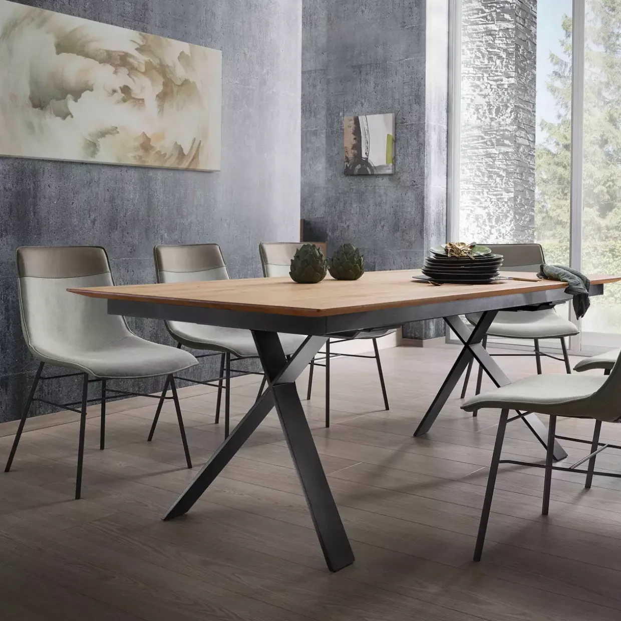 Eleganz trifft auf Funktionalität bei diesem Auszugstisch, gefertigt aus hochwertiger Asteiche. Der Linja-Tisch überzeugt durch seinen konventionellen Stil, der sich nahtlos in verschiedene Einrichtungsstile einfügt. Mit einer geölten Oberfläche bietet er ein angenehmes haptisches Erlebnis und einen natürlichen Look.Ein besonderes Highlight ist der Gestellauszug mit Einhandtechnik, der eine einfache Verlängerung ermöglicht. Diese innovative Technik sorgt dafür, dass sich der Tisch mühelos und ohne großen Kraftaufwand erweitern lässt. Die innenliegende, geklappte Verlängerungsplatte aus Holz bietet Ihnen zusätzliche 80 cm Platz, wenn Sie ihn benötigen. So bleiben Sie flexibel, ob für ein gemütliches Familienessen oder ein größeres Beisammensein mit Freunden.Die Kombination aus Holz und Metall verleiht dem Tisch nicht nur Stabilität, sondern auch eine zeitlose Ästhetik. Die X-förmigen Metallfüße setzen einen modernen Akzent und sorgen gleichzeitig für die notwendige Standfestigkeit. Die Farbkombination aus schwarzgrau und rustikaler Bianco-Asteiche unterstreicht den edlen Charakter dieses Möbelstücks.Ein Auszugstisch, der durch seine hochwertigen Materialien und durchdachte Funktionalität überzeugt, wird zum Herzstück jedes Essbereichs. Der Linja-Tisch ist mehr als nur ein Möbelstück; er ist ein Ausdruck von Stil und Praktikabilität.