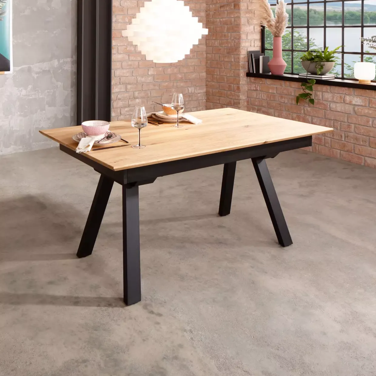 Besonders hervorzuheben ist die elegante Verbindung von Holz und Metall, die dem Tisch einen industriellen Charme verleiht, ohne dabei aufdringlich zu wirken. Diese Materialwahl unterstreicht die moderne Note und verleiht dem Möbelstück eine gewisse Leichtigkeit trotz seiner robusten Bauweise.