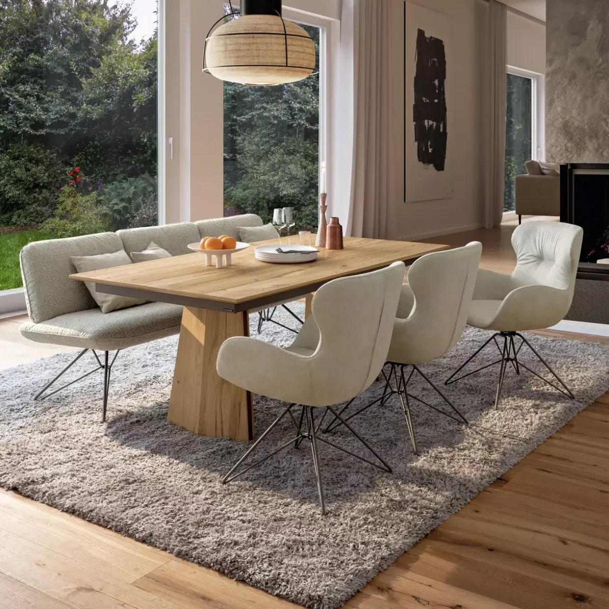 Eiche Rustio hell geölt – dieses Detail spricht für Qualität und Langlebigkeit. Der Esstisch beeindruckt mit seinem natürlichen Stil und bringt eine warme, einladende Atmosphäre in jeden Raum. Die Kombination aus Eiche und Holzwerkstoff verleiht dem Tisch eine robuste Struktur, die den Alltag mühelos meistert.