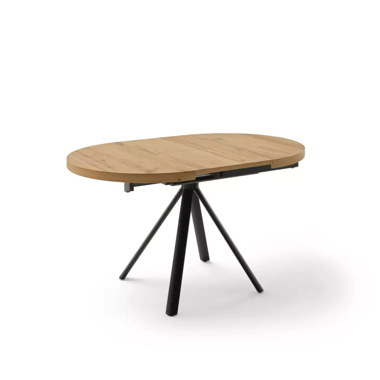 Vielseitigkeit trifft auf Funktionalität: Der Tisch mit Auszug bietet Ihnen die Möglichkeit, den Platz Ihren Bedürfnissen anzupassen. Ob ein gemütliches Abendessen im kleinen Kreis oder ein ausgedehntes Familienfest – der Tisch passt sich flexibel an. Der Kontrast zwischen der warmen Eichenoberfläche und den kühlen Metallbeinen schafft ein harmonisches Gesamtbild, das sowohl in klassischen als auch in modernen Einrichtungen Akzente setzt.