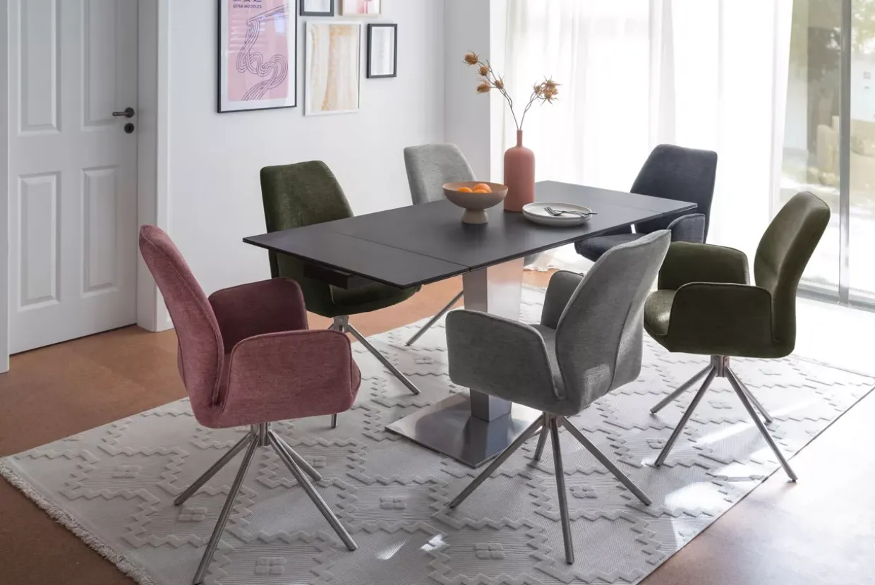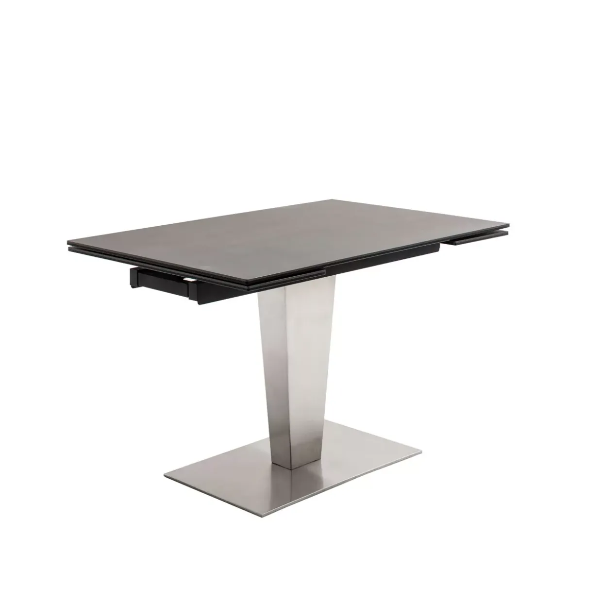 PESARO Auszugtisch mit Säule 120 (180) cmPesaro – ein Esstisch, der moderne Eleganz in Ihr Zuhause bringt. Die rechteckige Form dieses Auszugtisches ermöglicht es, ihn nahtlos in verschiedene Wohnstile zu integrieren. Seine gebürstete Oberfläche in Anthrazit verleiht dem Tisch eine stilvolle Optik, die sowohl dezent als auch auffällig ist.Die Kombination aus Glas, Metall und Keramik macht diesen Tisch zu einem langlebigen Begleiter für Ihre Mahlzeiten. Der Einsatz von Edelstahl unterstreicht seine Robustheit und verleiht ihm einen zeitgemäßen Charme. Besonders hervorzuheben ist seine ausziehbare Funktion, die es Ihnen erlaubt, den Tisch auf eine Länge von bis zu 180 cm zu erweitern – ideal für gesellige Abende mit Familie und Freunden.Die Säulenfußform sorgt für Stabilität und verleiht dem Tisch gleichzeitig eine elegante Silhouette. Diese Kombination aus Funktionalität und Design macht den Pesaro zu einer ausgezeichneten Wahl für jeden, der Wert auf Qualität und Stil legt. Die harmonische Materialwahl und das moderne Design machen diesen Esstisch zu einem Highlight in jedem Essbereich.Lassen Sie sich von der Vielseitigkeit und dem zeitlosen Design des Pesaro inspirieren und erleben Sie, wie er in Ihrem Raum eine einladende Atmosphäre schafft.