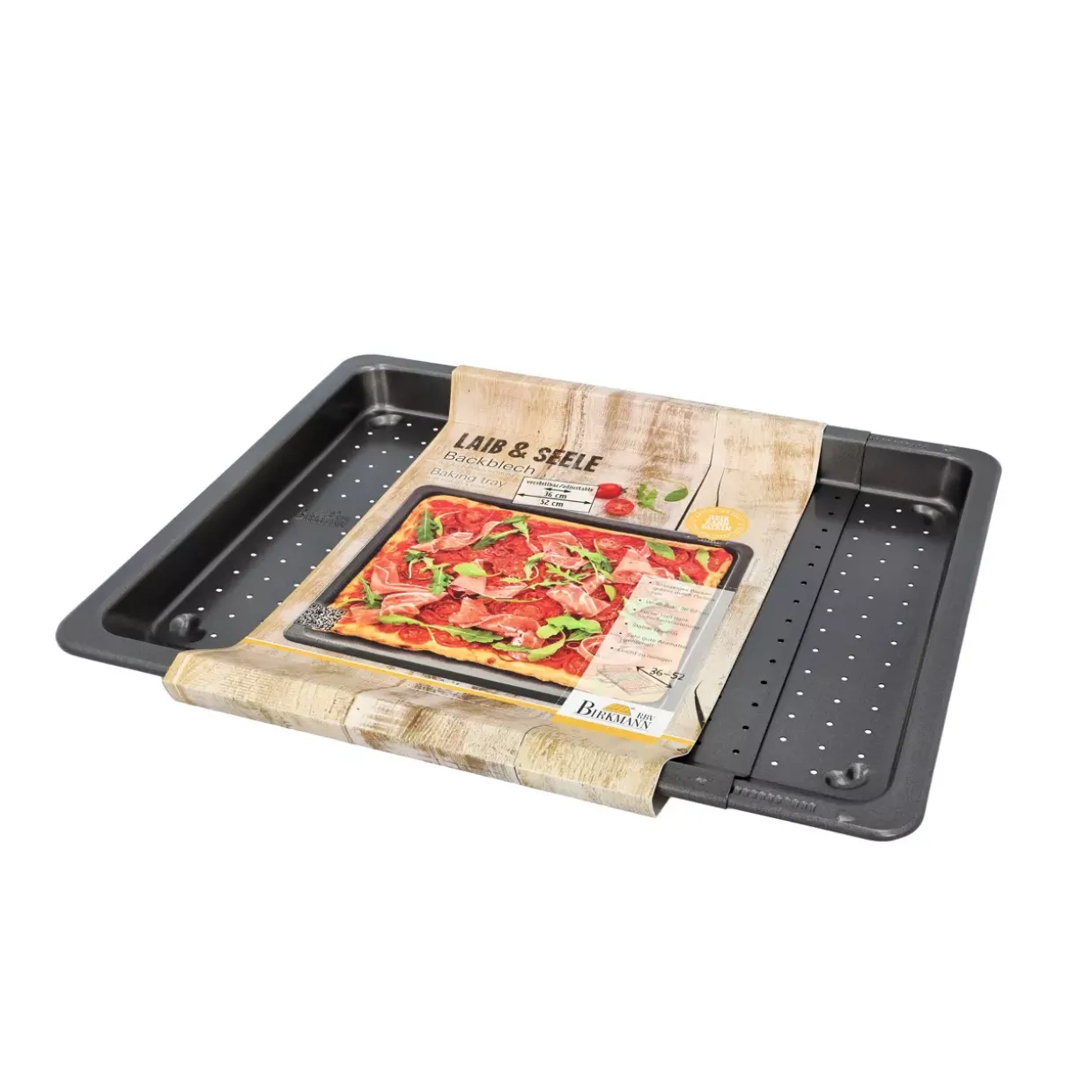 Ein Highlight ist die Antihaftbeschichtung, die das Anhaften von Speisen effektiv verhindert und die Reinigung erleichtert. Die praktischen Griffflächen ermöglichen ein sicheres Handling, auch wenn das Blech heiß aus dem Ofen genommen wird. Darüber hinaus sind Sie mit einem beiliegenden Rezept bestens gerüstet, um direkt loszulegen.