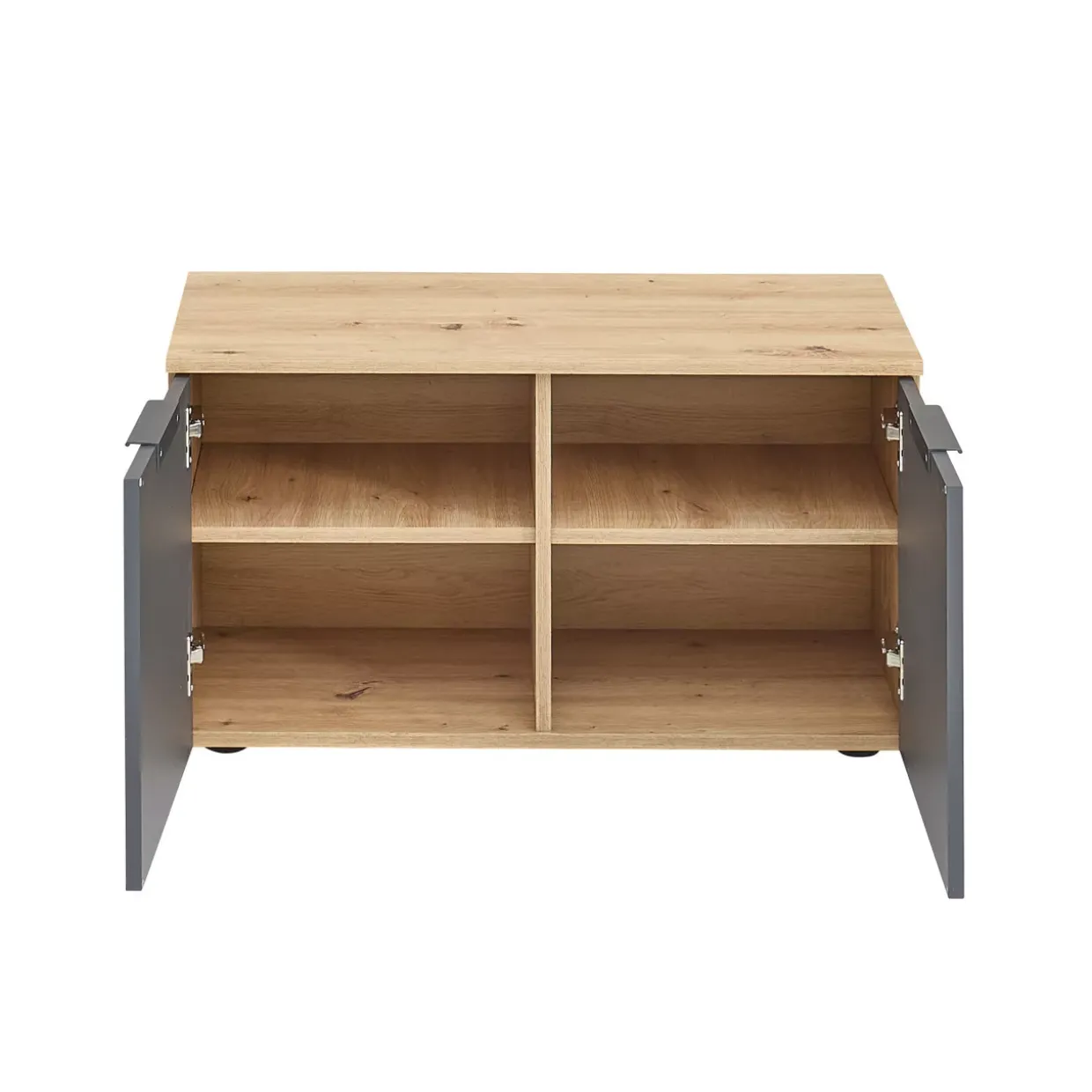 Artisan Eiche verleiht der Garderobe einen Hauch von natürlicher Eleganz. Die Kombination aus modernem Stil und traditionellen Elementen schafft eine harmonische Atmosphäre in Ihrem Eingangsbereich. Anthrazitfarbene Akzente bieten einen stilvollen Kontrast und unterstreichen das zeitgemäße Design.Rundfüße aus hochwertigem Holzwerkstoff sorgen für Stabilität und eine ansprechende Optik. Die folierte Oberfläche bietet eine pflegeleichte und langlebige Lösung, die den täglichen Anforderungen problemlos standhält. Zwei Türen bieten ausreichend Stauraum, um Ordnung und Struktur in Ihre Garderobe zu bringen.Die Verwendung von Holzwerkstoff garantiert eine nachhaltige und umweltfreundliche Wahl, ohne Kompromisse bei der Ästhetik einzugehen. Durchdachte Details und eine klare Linienführung machen dieses Möbelstück zu einem zeitlosen Begleiter.Funktionalität trifft auf Design: Diese Garderobe fügt sich nahtlos in moderne Wohnkonzepte ein und bietet gleichzeitig praktischen Nutzen. Ob im Flur oder im Ankleidezimmer, sie wird schnell zu einem unverzichtbaren Bestandteil Ihres Zuhauses. Dank der hochwertigen Materialien und der sorgfältigen Verarbeitung können Sie sich auf eine langlebige und zuverlässige Nutzung verlassen. Ein Möbelstück, das sowohl durch seine Optik als auch durch seine Funktionalität überzeugt.