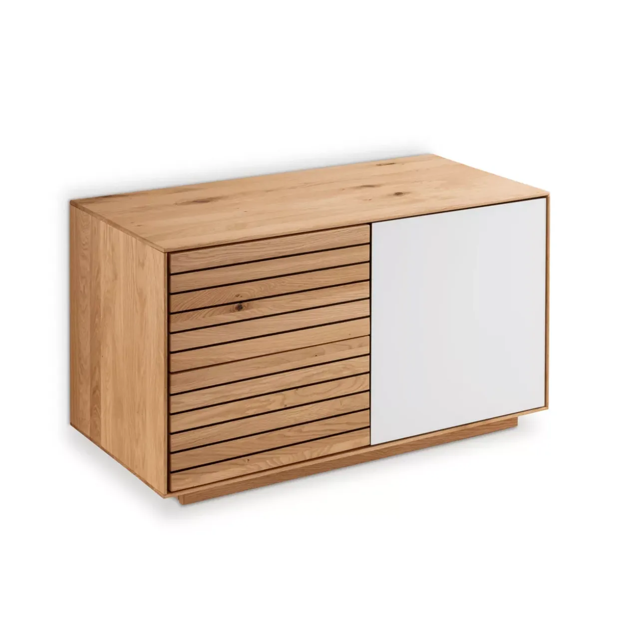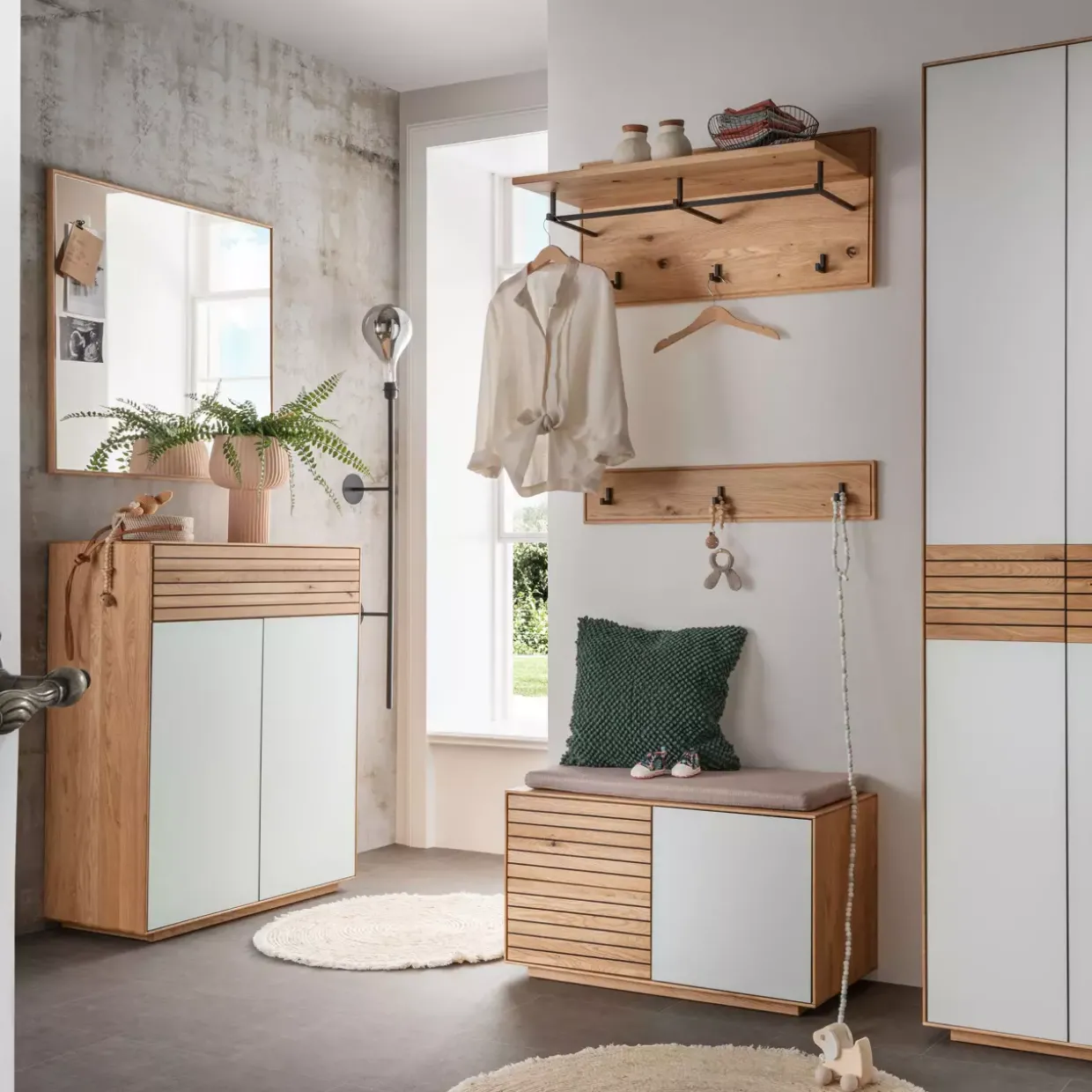 Die Drehtür dieser Bank ist mit der innovativen Push-To-Open-Funktion ausgestattet, die eine mühelose Handhabung ermöglicht. Das Soft-Close-System sorgt dafür, dass die Tür sanft und leise schließt, was den Komfort weiter erhöht. Die melaminharzbeschichtete und geölte Oberfläche verleiht der Bank nicht nur eine ansprechende Optik, sondern schützt auch das Holz und trägt zur Langlebigkeit bei.