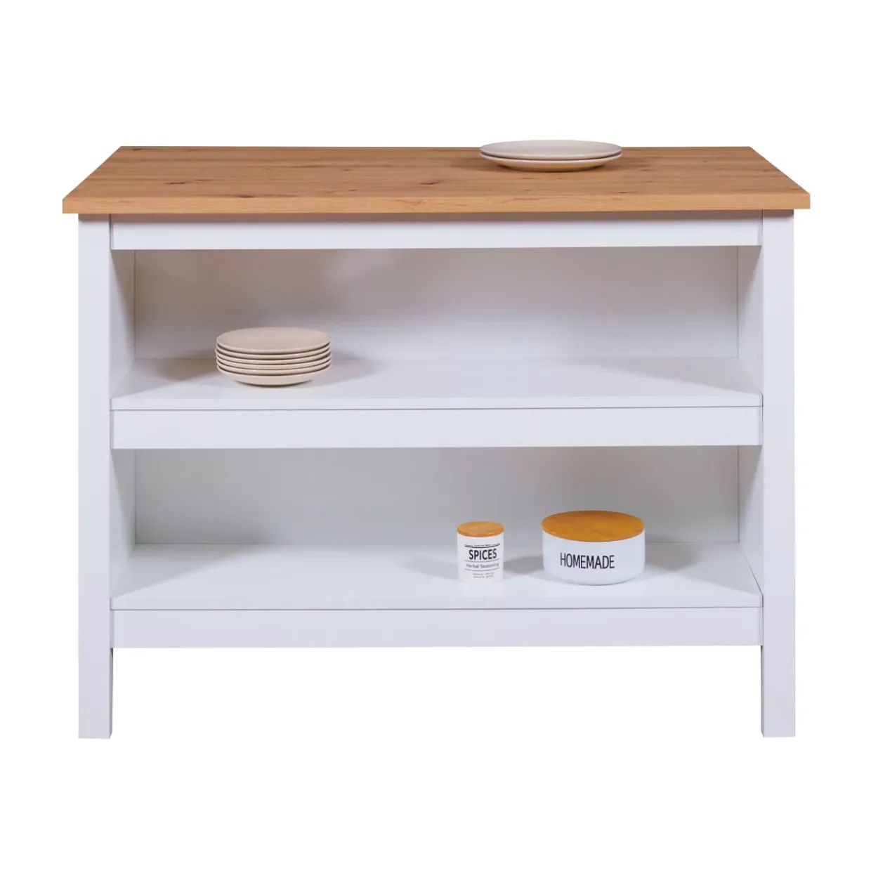 Dieser Bartisch eignet sich hervorragend als Kücheninsel. Er ist ideal, um zwei hohe Hocker auf einer Seite aufzustellen, sodass Sie dort bequem essen können. Auf der anderen Seite bietet er praktische Aufbewahrungsmöglichkeiten mit zwei breiten Regalen, die viel Stauraum für Geschirr und Küchenutensilien bieten. Jede der beiden Nischen hat großzügige Innenmaße von 109 cm Länge, 33 cm Tiefe und 31 cm Höhe, sodass alles griffbereit und ordentlich verstaut werden kann. Der Bartisch „Julina“ ist somit eine perfekte Ergänzung für Ihre Küche, die Funktionalität und Ästhetik harmonisch vereint.