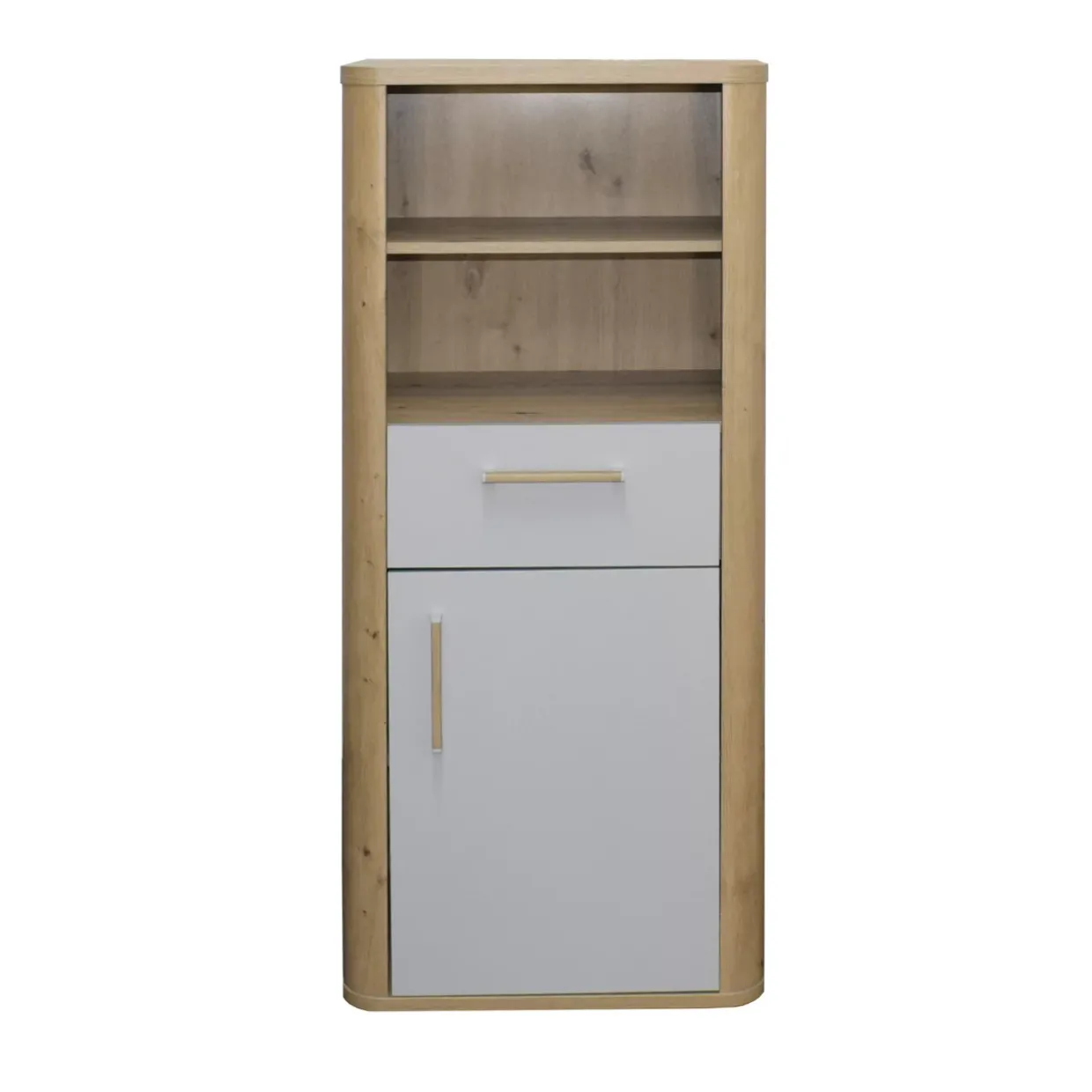 Ein modernes Design trifft auf Funktionalität. Der Beistellschrank in stilvoller Kombination aus Dekor Asteiche und kreidegrau matt lack bietet eine elegante Lösung für die ganzjährige Nutzung. Die beidseitig anschlagbare Drehtür, ausgestattet mit einem Türdämpfer und Soft-Close-System, garantiert sanftes und leises Schließen.