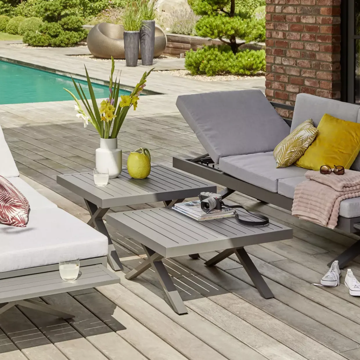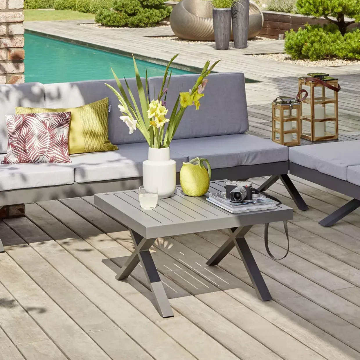 Quadratische Eleganz trifft modernen Stil: Der Beistelltisch Rieke präsentiert sich als perfekter Begleiter für die Sommermonate. Mit seiner ansprechenden X-Fuß-Konstruktion aus hochwertigem Aluminium verleiht er jedem Gartenbereich eine stilvolle und zugleich stabile Basis. Die anthrazitfarbene Oberfläche fügt sich harmonisch in verschiedene Gestaltungskonzepte ein, während das robuste Metallmaterial für Langlebigkeit sorgt.