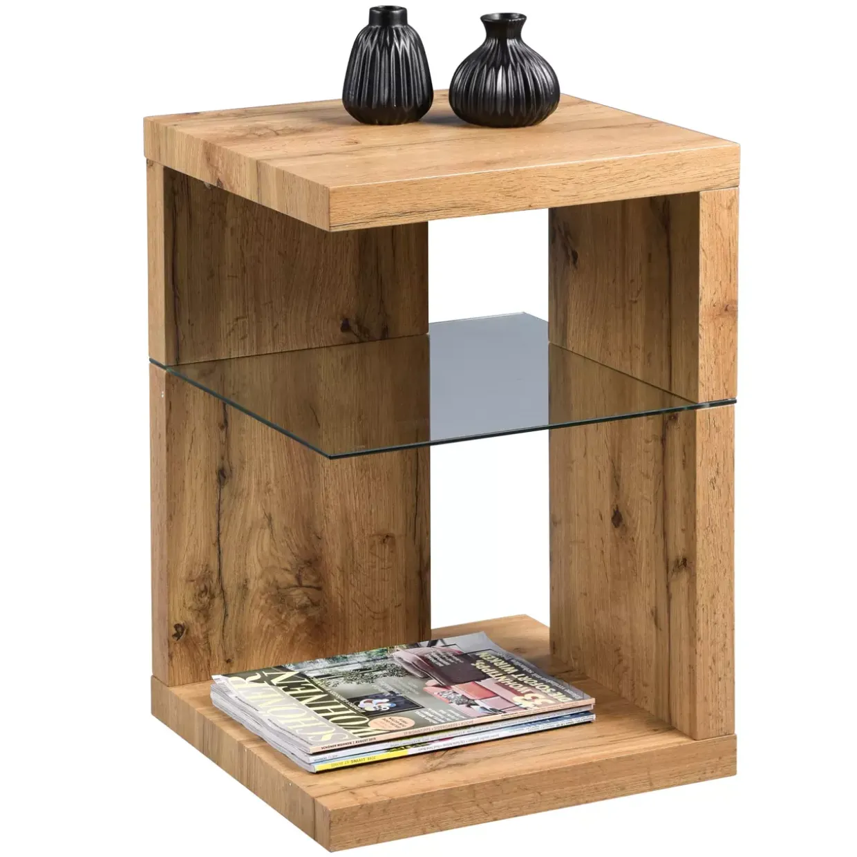 Die Kombination aus hochwertigem Holzwerkstoff und Sicherheitsglas bietet nicht nur eine ansprechende Ästhetik, sondern auch funktionale Sicherheit. Foliert für zusätzlichen Schutz, bleibt die Oberfläche auch bei regelmäßigem Gebrauch in bestem Zustand. Die moderne Gestaltung fügt sich nahtlos in verschiedenste Einrichtungsstile ein und bietet einen stilvollen Platz für Dekorationen oder alltägliche Gegenstände.