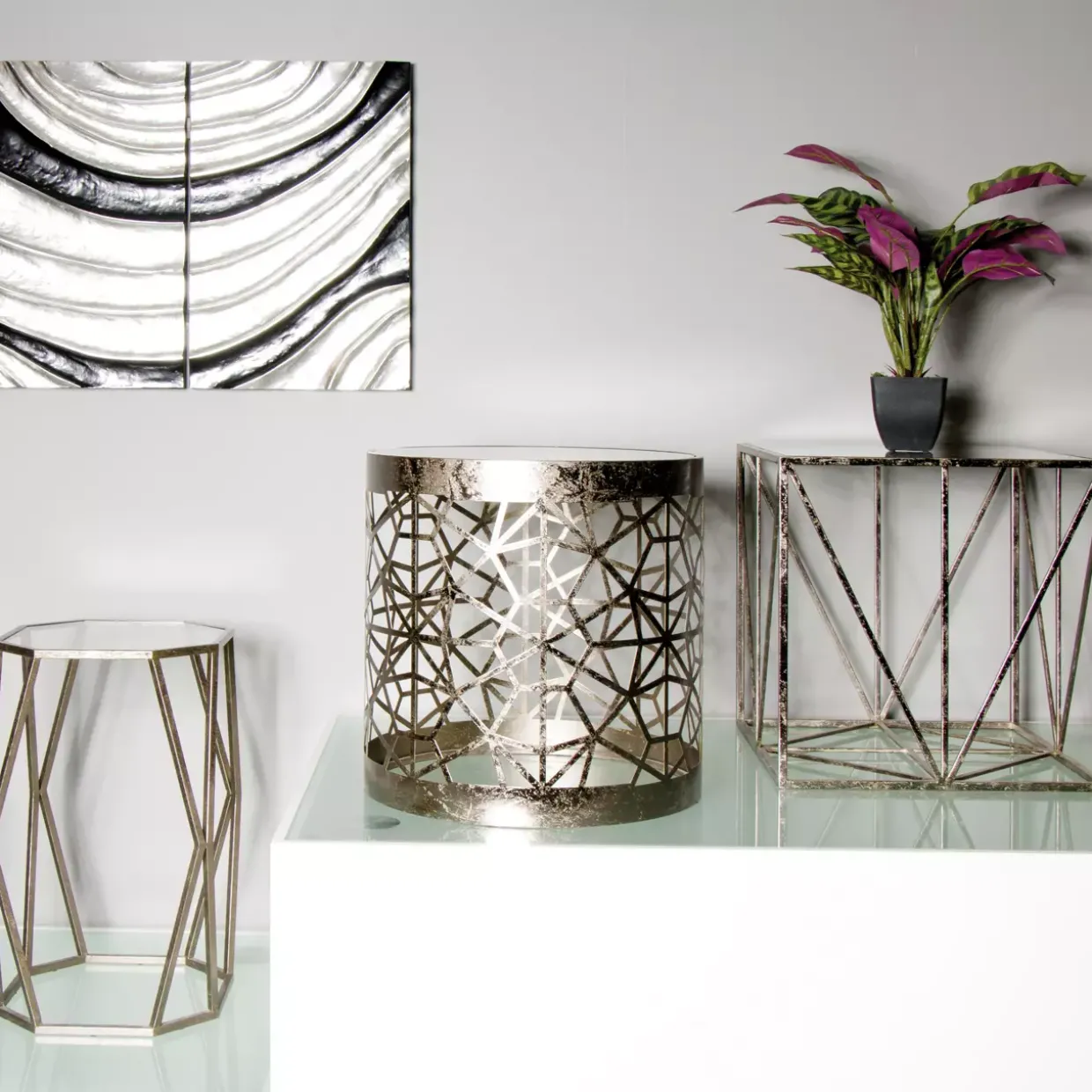 Die Form des Tisches bietet eine vielseitige Nutzbarkeit, sei es als dekoratives Element im Wohnzimmer oder als praktischer Begleiter neben dem Sofa. Durch sein dezentes und zugleich markantes Design harmoniert er mit verschiedensten Einrichtungsstilen und fügt sich nahtlos in Ihre bestehende Einrichtung ein. Die Farbgebung in Antikbronze und Glas verleiht dem Tisch eine edle Note, die sowohl klassisch als auch modern wirkt.