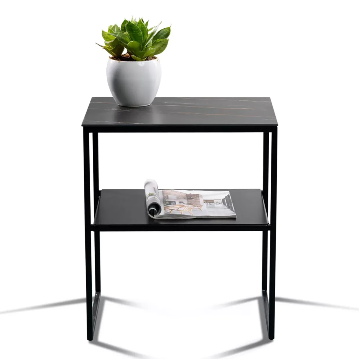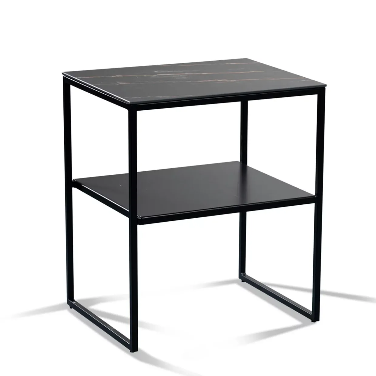 Der Medina 2 Beistelltisch besticht durch seinen modernen Stil und fügt sich nahtlos in jedes zeitgenössische Interieur ein. Mit seiner eleganten Farbgebung in Schwarz und gesintertem Stein in Dunkelgrau bietet er eine ästhetisch ansprechende Kombination, die sowohl dezent als auch markant wirkt.