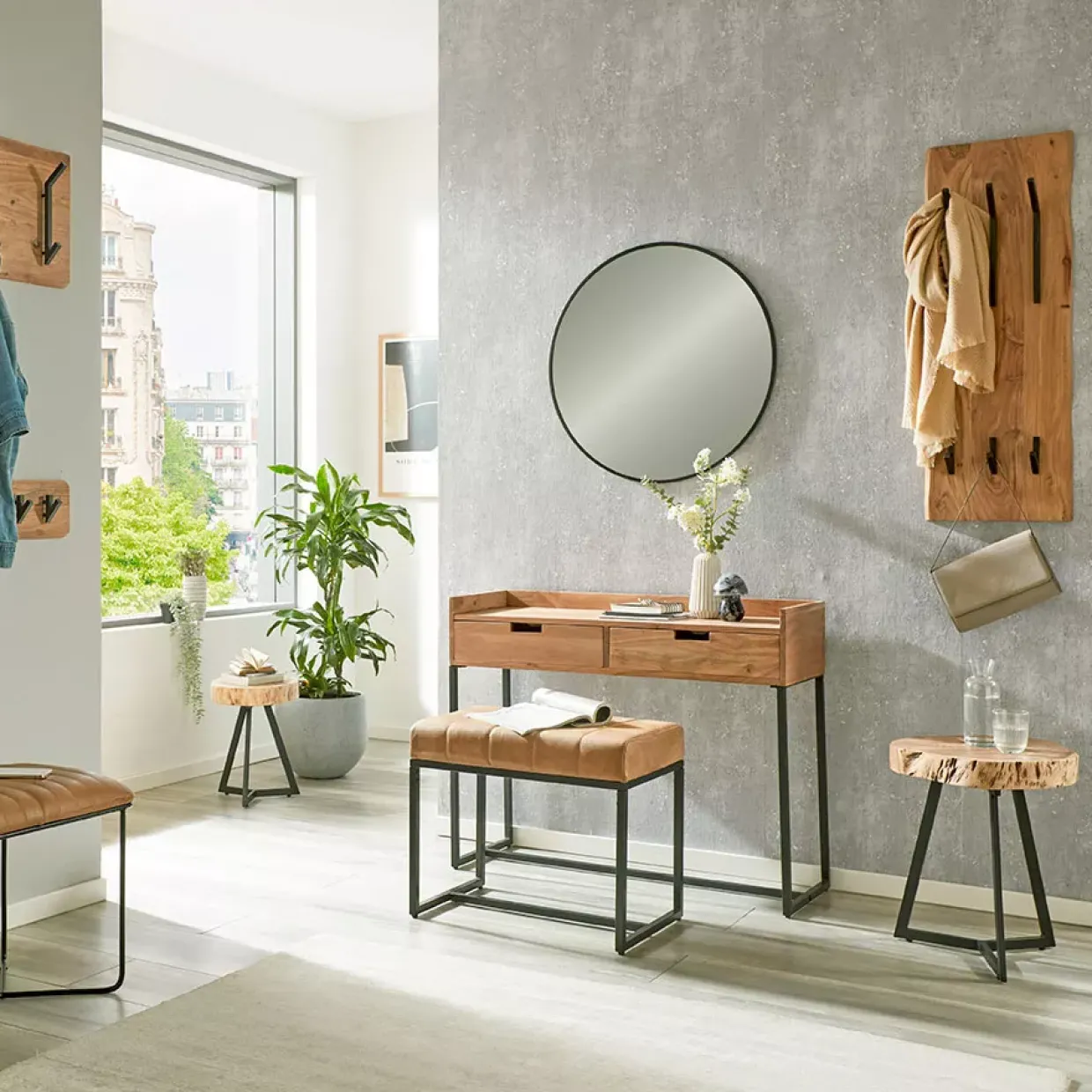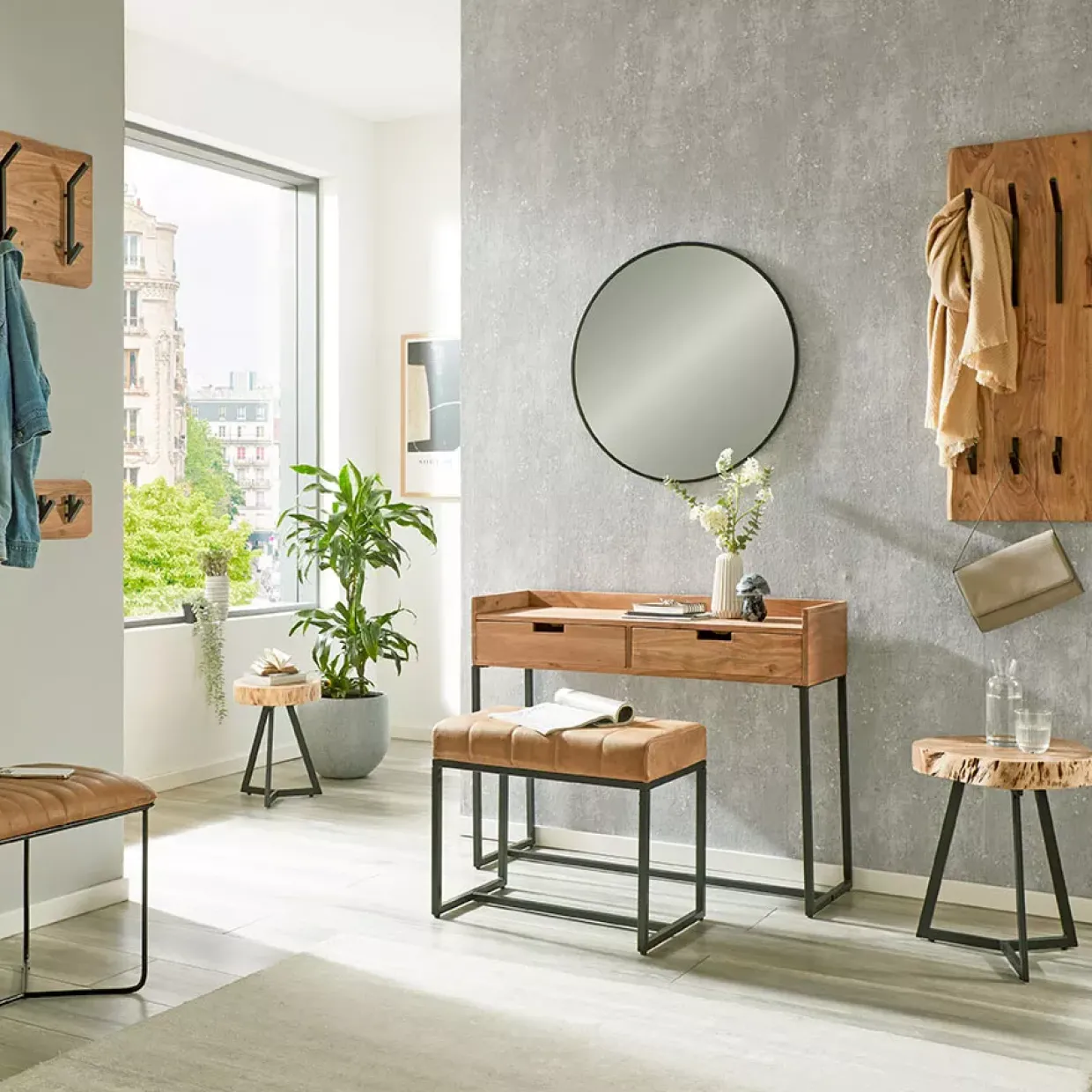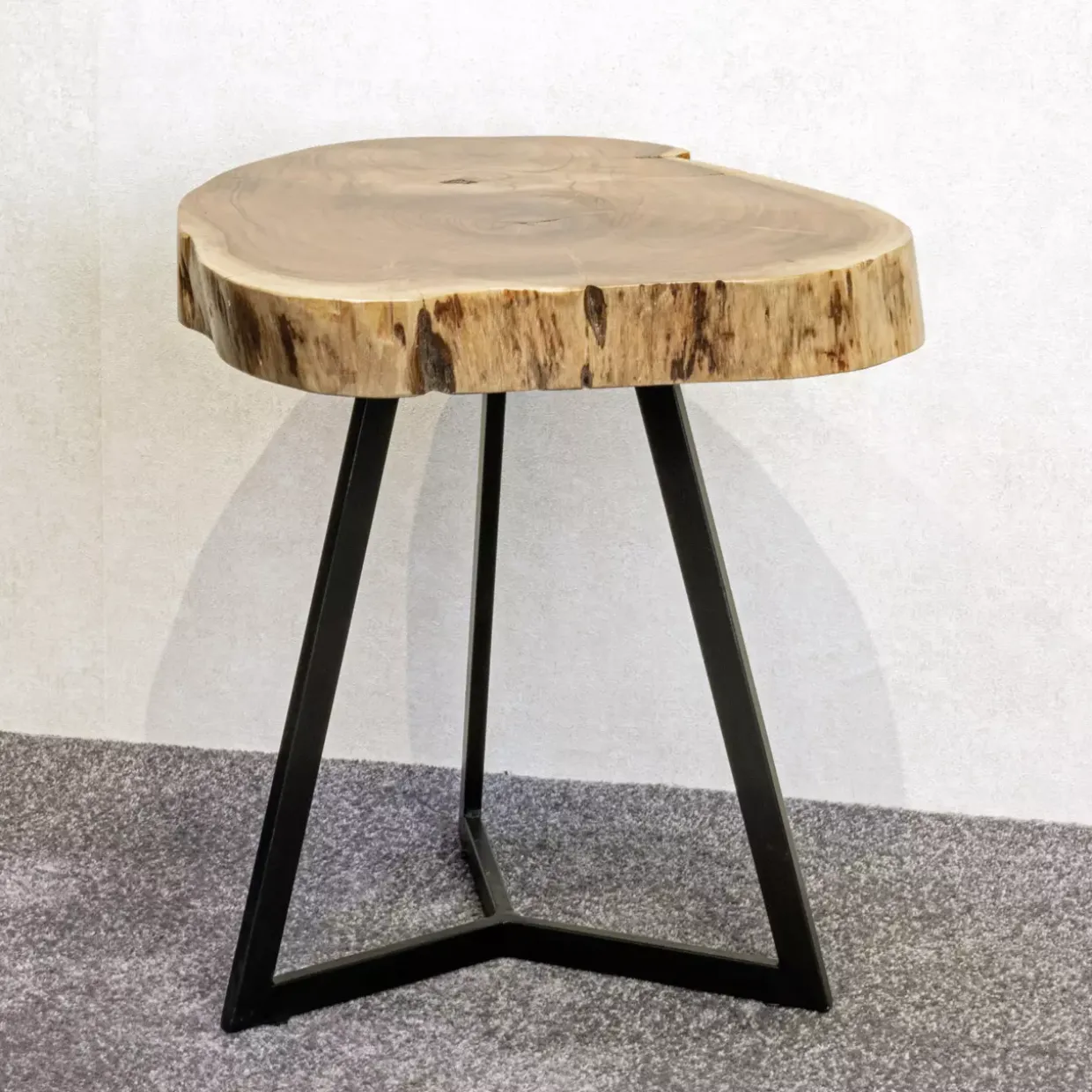 Der Patna Beistelltisch vereint zeitloses Design mit hochwertigen Materialien und fügt sich nahtlos in jedes moderne Zuhause ein. Mit einer massiven Akazienholzplatte bietet er eine robuste und langlebige Oberfläche, die durch ihre natürliche Maserung und warme Farbgebung besticht. Das schwarze Metallgestell verleiht dem Tisch eine elegante, industrielle Note und sorgt für Stabilität.