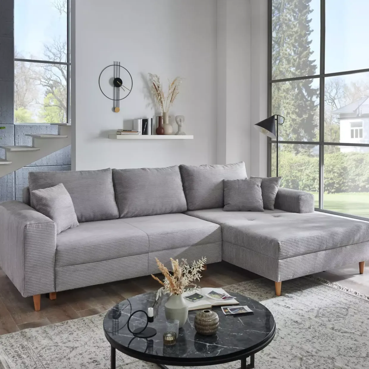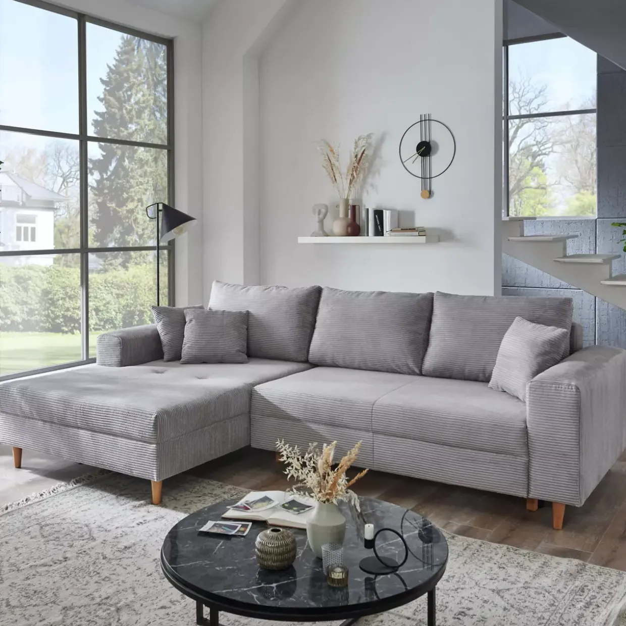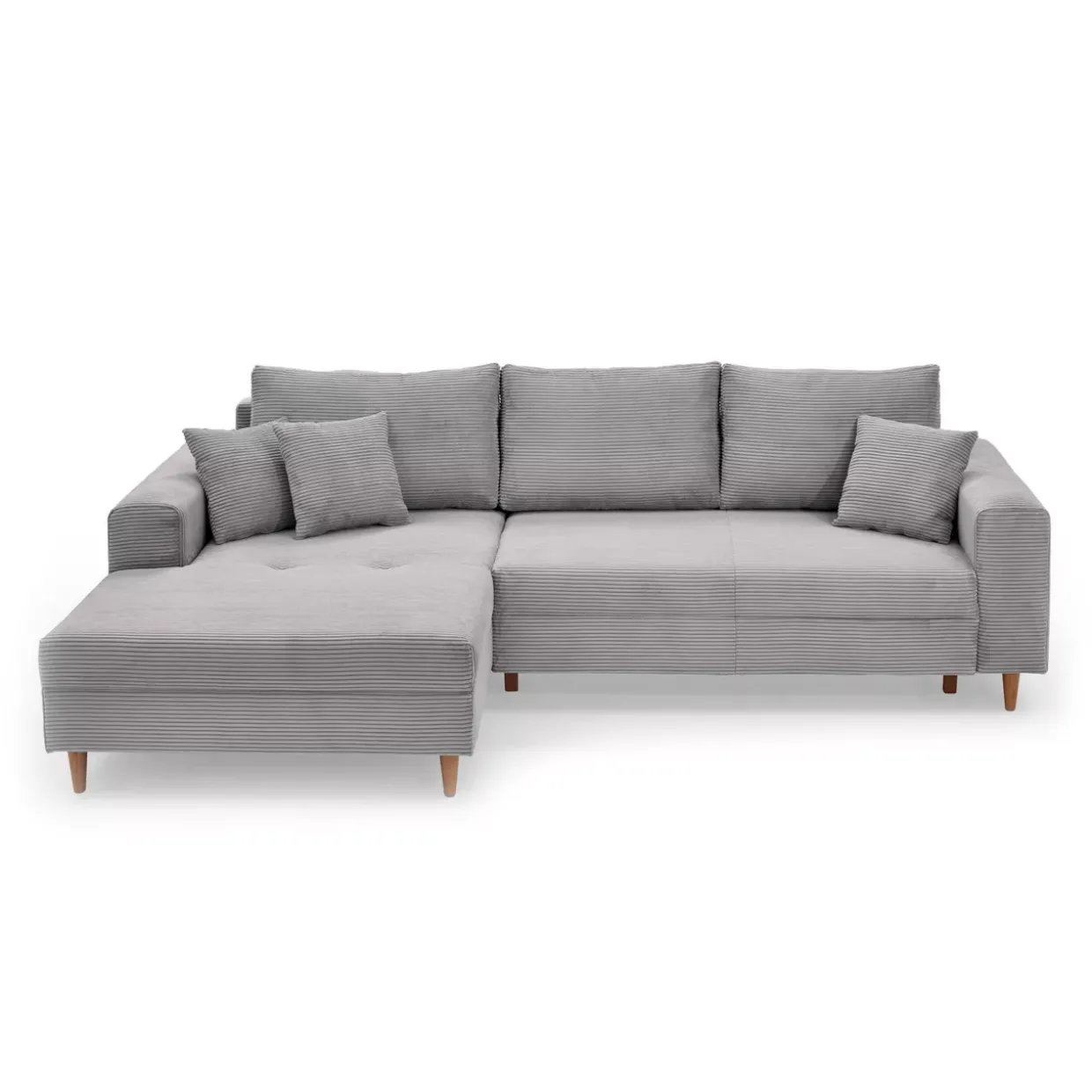 Die moderne Bern Polsterecke vereint Funktionalität und Stil in einem harmonischen Design. Die Kombination aus hellgrauem Cordstoff und Eiche-Holzelementen schafft eine zeitgemäße Ästhetik, die in jedem Raum einen eleganten Akzent setzt. Durch die integrierte Schlaffunktion verwandelt sich das Möbelstück im Handumdrehen in eine komfortable Schlafgelegenheit.