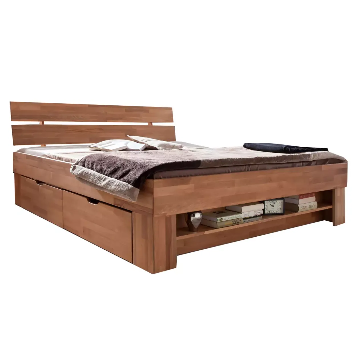 Ein besonderes Highlight dieser Futonliege sind die vier integrierten Bettkästen. Diese bieten Ihnen praktischen Stauraum für Bettwäsche oder andere Utensilien und tragen zur Ordnung in Ihrem Schlafzimmer bei. Das zusätzliche Fußteilregal schafft weiteren Platz für Bücher oder Dekorationen und fügt sich harmonisch in das Gesamtdesign ein.