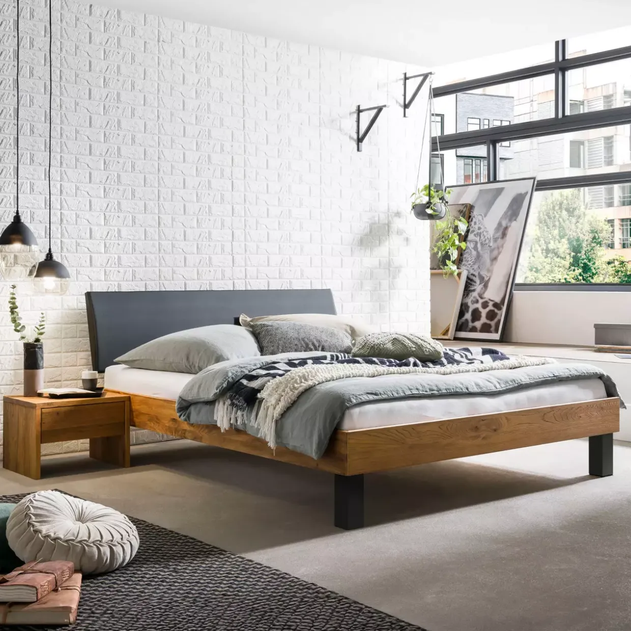 Anthrazitfarbene Stoffelemente ergänzen das Design und bieten einen stilvollen Kontrast zur natürlichen Holzoptik. Die Farbgebung in Smoke Anthrazit verleiht dem Bett eine moderne Note, während die Materialien Holz, Stoff und Metall harmonisch zusammenwirken, um ein stimmiges Gesamtbild zu erzeugen.