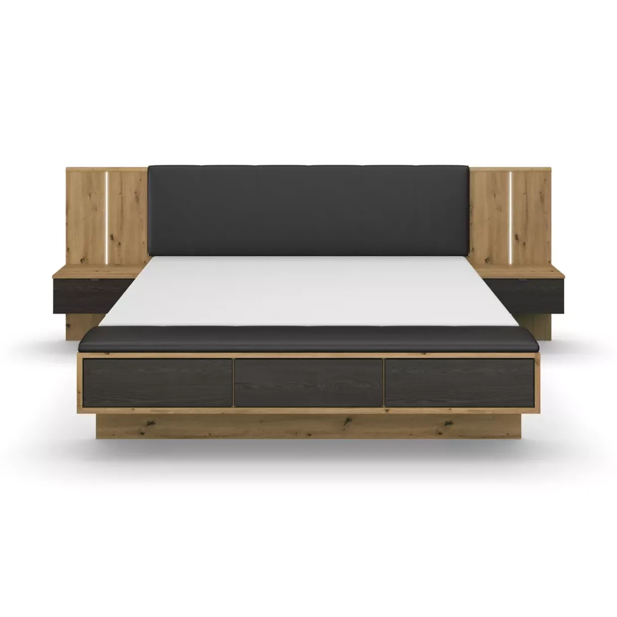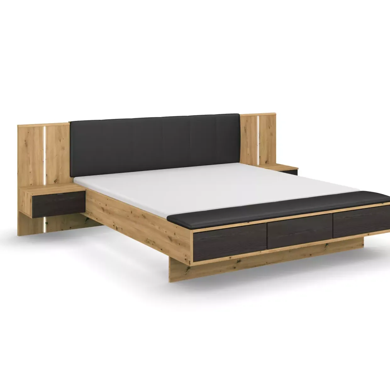 Dekor-Druck Eiche Artisan, ergänzt durch Akzente in Eiche schwarz, schafft eine harmonische Verbindung zwischen Natur und Moderne. Graue metallic Details fügen eine subtile, industrielle Note hinzu, die den modernen Stil der Bettanlage unterstreicht. Die senkrechte LED-Beleuchtung ist nicht nur ein optischer Blickfang, sondern auch praktisch und sorgt für eine angenehme Atmosphäre im Schlafzimmer.
