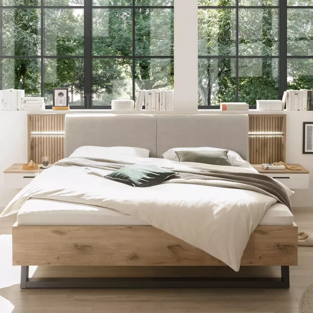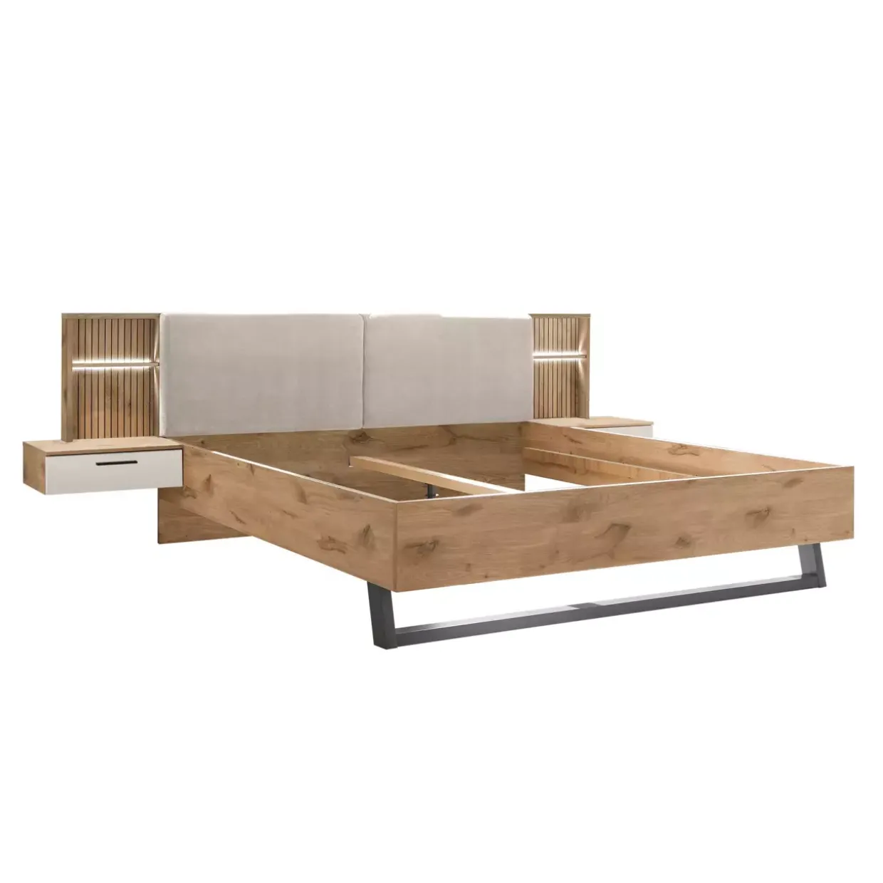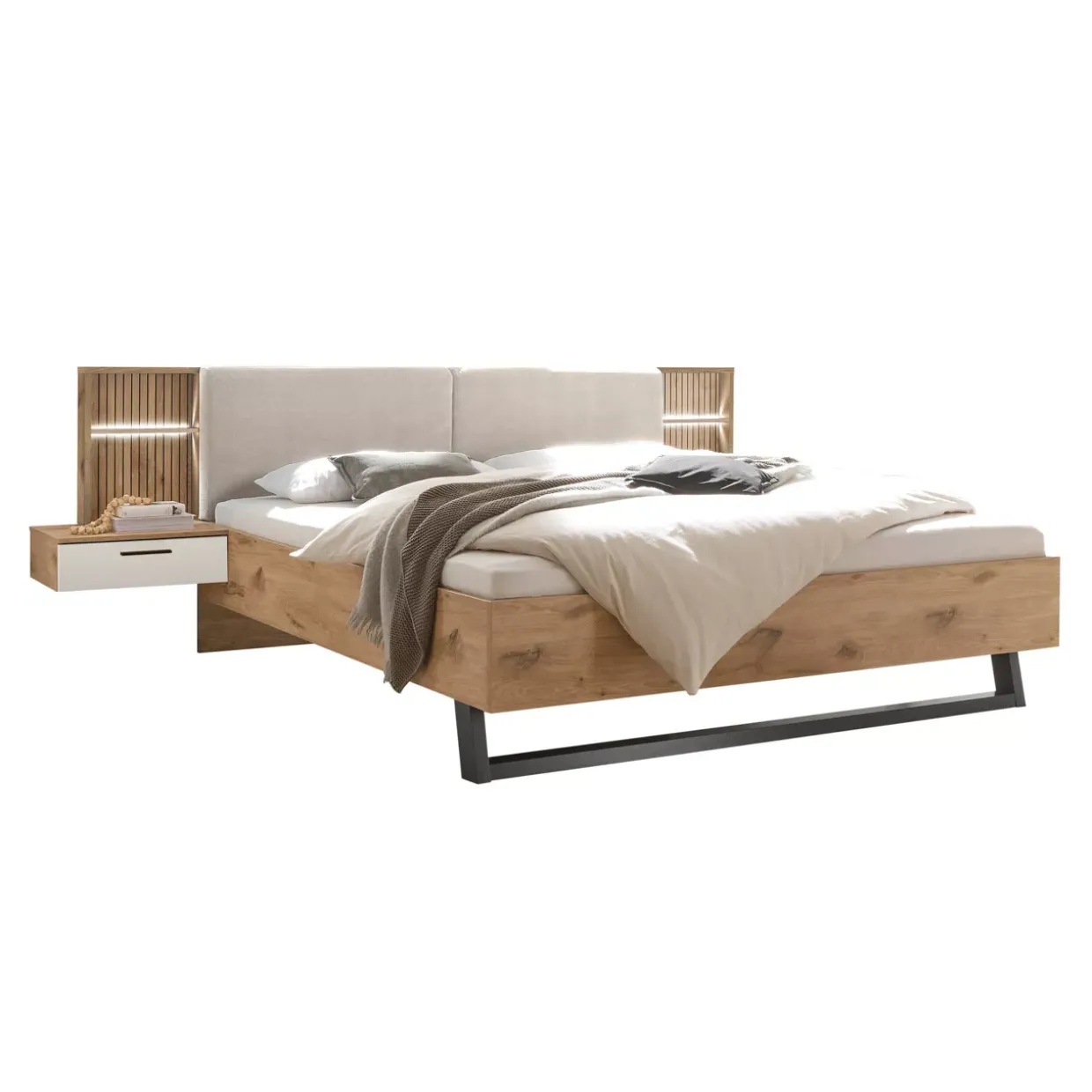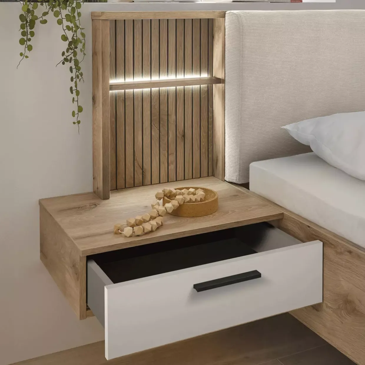 In der Farbe Weiß gehalten, harmoniert diese Bettanlage hervorragend mit der hellen Viking Oak Optik und bietet eine helle, freundliche Atmosphäre. Der Kontrast zwischen den Farben und Materialien unterstreicht das moderne Design, ohne aufdringlich zu wirken. Diese subtile Eleganz macht das Modell zu einem vielseitigen Möbelstück, das sich nahtlos in verschiedene Einrichtungsstile einfügt.