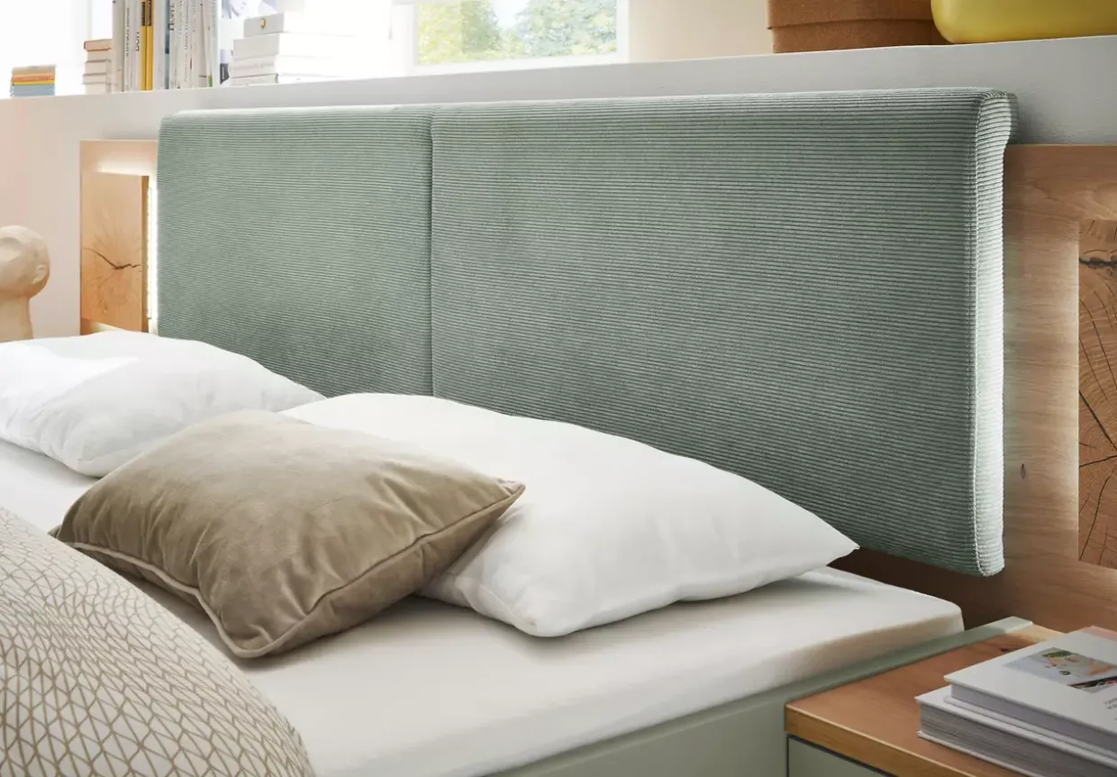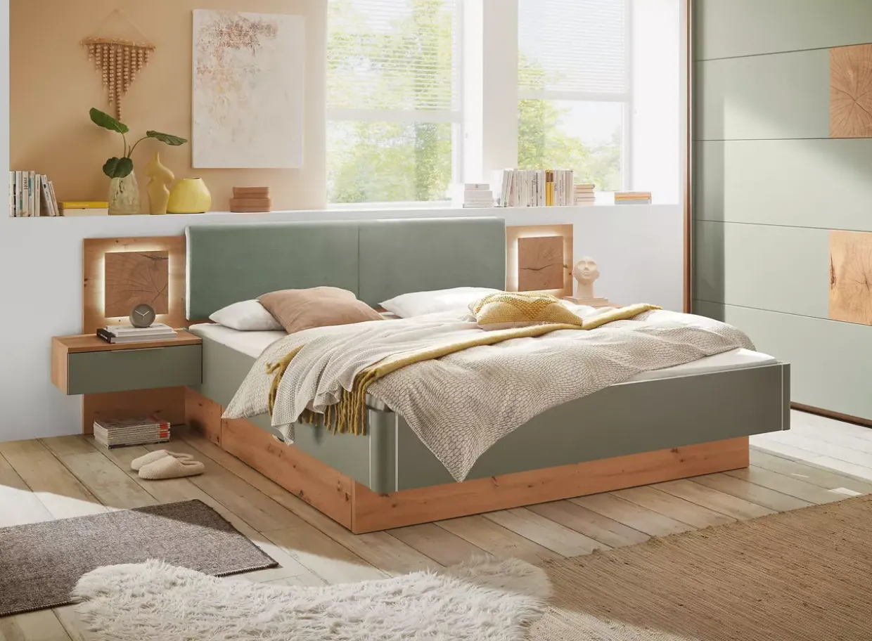 Artisan Eiche trifft auf zeitlosen Stil und schafft eine warme, einladende Atmosphäre in Ihrem Schlafzimmer. Die Simada LIV’IN Bettanlage besticht durch ihr harmonisches Design, das die natürliche Schönheit des Holzwerkstoffes hervorhebt. In Kombination mit der sanften Farbe Salbei entsteht ein Gefühl der Ruhe und Geborgenheit.