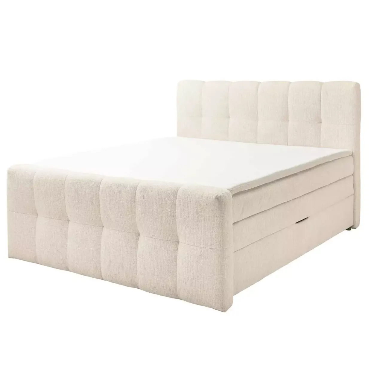 Obermatratze: Tonnentaschenfederkern inkl. Komfort T25 Schaum-Topper (4 cm), Bezug waschbar bis 40° Box: stabiles Gestell aus Holzwerkstoffen, Kunststofffüße, 4-Gang-Bonell-Federkern 2.2mm, 1 Lage mit 1cm Schaum T 25 inkl. Bettkasten, seitlich zu öffnen Farbton: Kansas 01 pearl Größe: 180x200cm Stil: Modern Material: Bezug Stoff Funktionen: Bettkasten Liegefläche cm: 180x200cm bestehend aus: 1 Boxspringbett Textilart: Bezug Polyester 100% maximale Belastbarkeit: 120 kg Highlights
