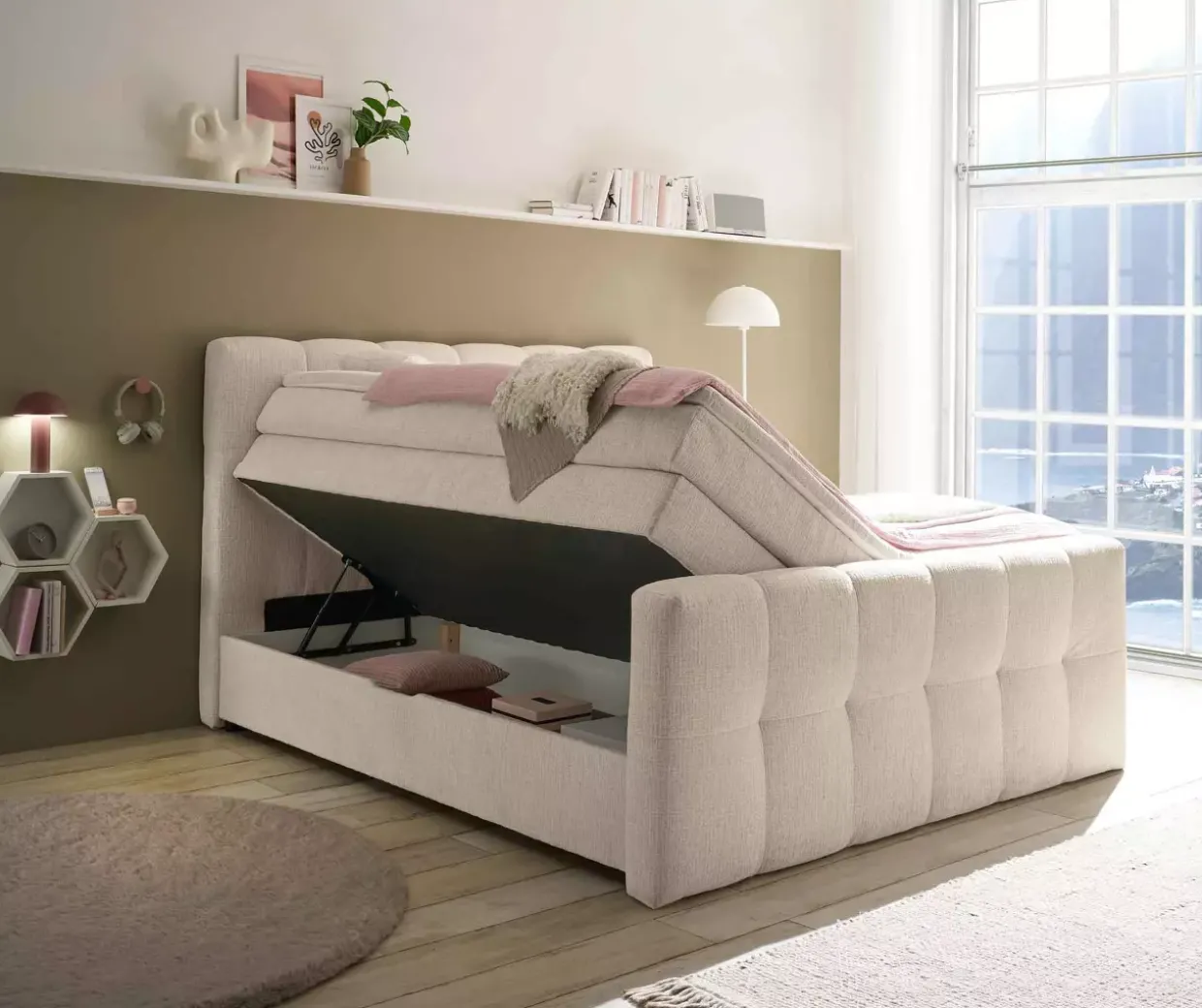Im Herzen des modernen Designs vereint die Boxspring den Stil der Zeit mit praktischen Funktionen. Die Farbe Kansas Pearl verleiht dem Möbelstück einen Hauch von Eleganz und lässt es in jedem Raum strahlen. Gefertigt aus Polyester, bietet der hochwertige Stoff nicht nur eine angenehme Haptik, sondern auch Langlebigkeit.Ein besonderes Highlight ist der Komfort T25 Schaum-Topper mit einer Höhe von 4 cm, dessen Bezug sich bei bis zu 40° waschen lässt. Diese Eigenschaft sorgt für Hygiene und Frische, wann immer Sie es benötigen. Die Obermatratze aus Tonnentaschenfederkern gewährleistet eine optimale Unterstützung und punktet mit ihrer Anpassungsfähigkeit an den Körper.Stabilität und Robustheit bieten die aus Holzwerkstoffen gefertigte Box und die Kunststofffüße. Der 4-Gang-Bonell-Federkern 2.2 mm, ergänzt durch eine Lage mit 1 cm Schaum T25, sorgt für ein angenehmes Liegegefühl. Ein weiteres bemerkenswertes Merkmal ist der integrierte Bettkasten, der sich seitlich öffnen lässt und praktischen Stauraum bietet.Die Kombination aus hochwertigen Materialien und durchdachter Funktionalität macht dieses Möbelstück zu einer erstklassigen Wahl. Ob im Schlafzimmer oder Gästezimmer, es fügt sich harmonisch in jedes Ambiente ein und bietet Komfort und Eleganz in einem.