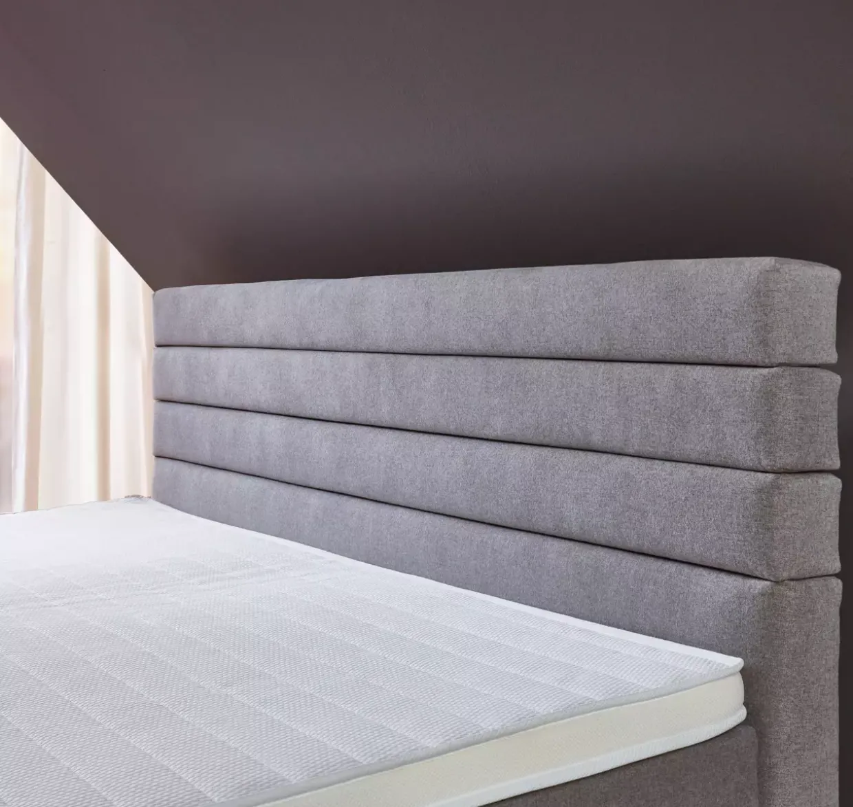 Das höhenverstellbare Kopfteil des Kokomo Boxspringbetts zeigt sich als perfekte Lösung für Räume mit Dachschrägen. Ein Design, das sowohl konventionell als auch modern wirkt, besticht durch seine elegante Kombination aus robustem Holzwerkstoff, langlebigem Kunststoff und weichem Stoff. Solche Materialien versprechen nicht nur Langlebigkeit, sondern auch ein angenehmes Schlafklima.Die Farbgebung in Silber und Schwarz fügt sich nahtlos in nahezu jedes Interieur ein, ohne dabei aufdringlich zu sein. Hier treffen Funktionalität und Ästhetik aufeinander, um ein harmonisches Gesamtbild zu schaffen. Die durchdachte Konstruktion des Kopfteils ermöglicht eine individuelle Anpassung, die den Komfort für Sie maximiert, unabhängig von der Raumhöhe.Ein Bettsystem, das nicht nur durch seine äußeren Werte überzeugt, sondern auch durch seine inneren Qualitäten. Die Kombination der Materialien sorgt für Stabilität und Komfort – eine wohltuende Einladung zu erholsamen Nächten. Ob in einem modernen Loft oder einem gemütlichen Dachzimmer, das Kokomo Boxspringbett verspricht einen erholsamen Rückzugsort. Ein Möbelstück, das stilvolle Akzente setzt und gleichzeitig praktische Vorteile bietet. Eine Investition in hochwertigen Schlafkomfort, die sich langfristig auszahlt.