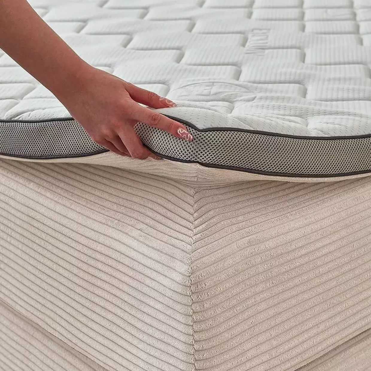 Ein abgerundetes Kopfteil mit Ziernähten verleiht diesem Boxspringbett eine elegante Note. Die Kombination aus Cord-Gewebe und Polyester sorgt für eine angenehme Haptik und eine moderne Optik. Durchdachte Funktionalität zeigt sich im integrierten Bettkasten, dessen Deckel dank Gasdruckfeder mühelos von vorne zu öffnen ist. Ventilationsöffnungen im Boden gewährleisten eine optimale Belüftung.