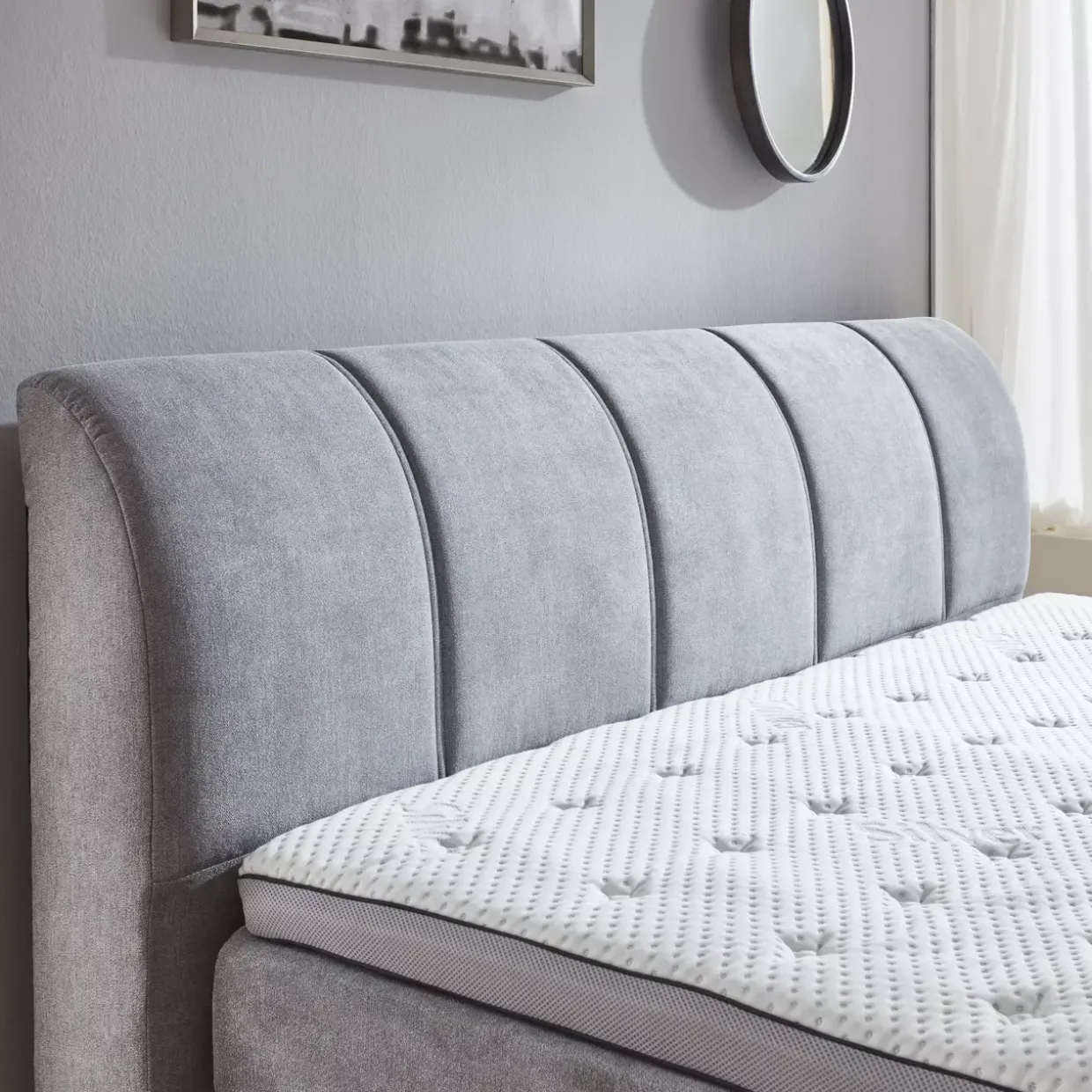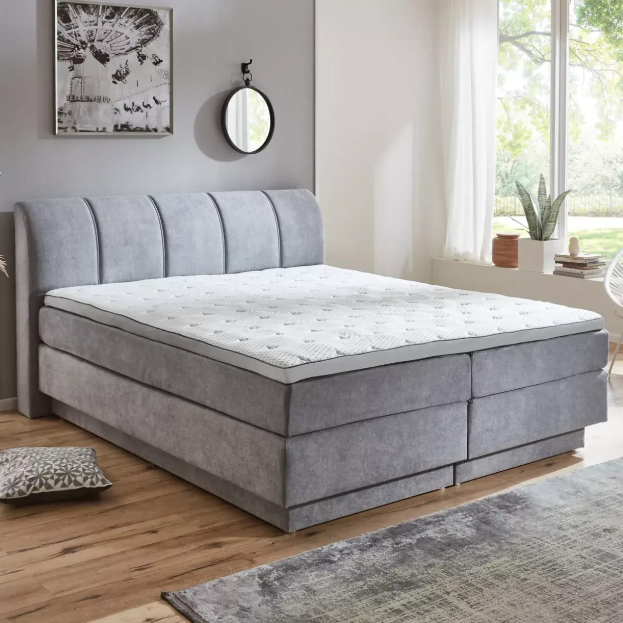Der Bettkasten des Ottawa Boxspring-Betts bietet zusätzlichen Stauraum, der im Schlafzimmer oft unverzichtbar ist. In einem konventionellen Stil gehalten, fügt sich dieses Möbelstück harmonisch in verschiedene Einrichtungsstile ein. Das zurückhaltende Grau der Oberflächen verleiht dem Bett eine zeitlose Eleganz, die Ruhe und Gelassenheit ausstrahlt.