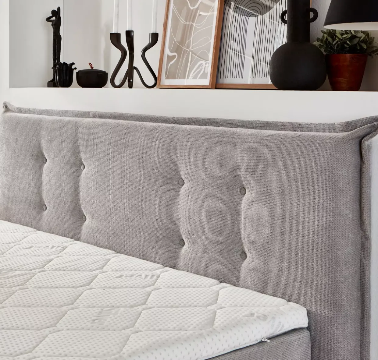 Komfort wird durch die sorgfältig gestaltete Kopfteilpolsterung mit Knöpfen hervorgehoben, die nicht nur visuell ansprechend ist, sondern auch zusätzlichen Halt bietet. Die Textilart aus Polyamid und Polyester sorgt für eine angenehme Haptik und ist gleichzeitig pflegeleicht und strapazierfähig. Das Bett fügt sich harmonisch in unterschiedliche Einrichtungsstile ein und bietet eine stilvolle Ergänzung für jedes Schlafzimmer.