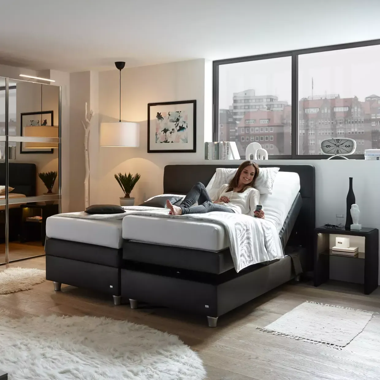 Härtegrad H2 / H3 Farbton: Bezug anthrazit / Füße Alufarben Größe: 180x200cm Faseranteile: Kunstleder 100% Funktionen: motorisch verstellbar Stil: Modern Härtegrad: H2 / H3 Material: Bezug Stoff Anzahl: Matratzen 2 Matratzenkern: Tonnentaschenfederkern bestehend aus: 1 Boxspringbett Highlights