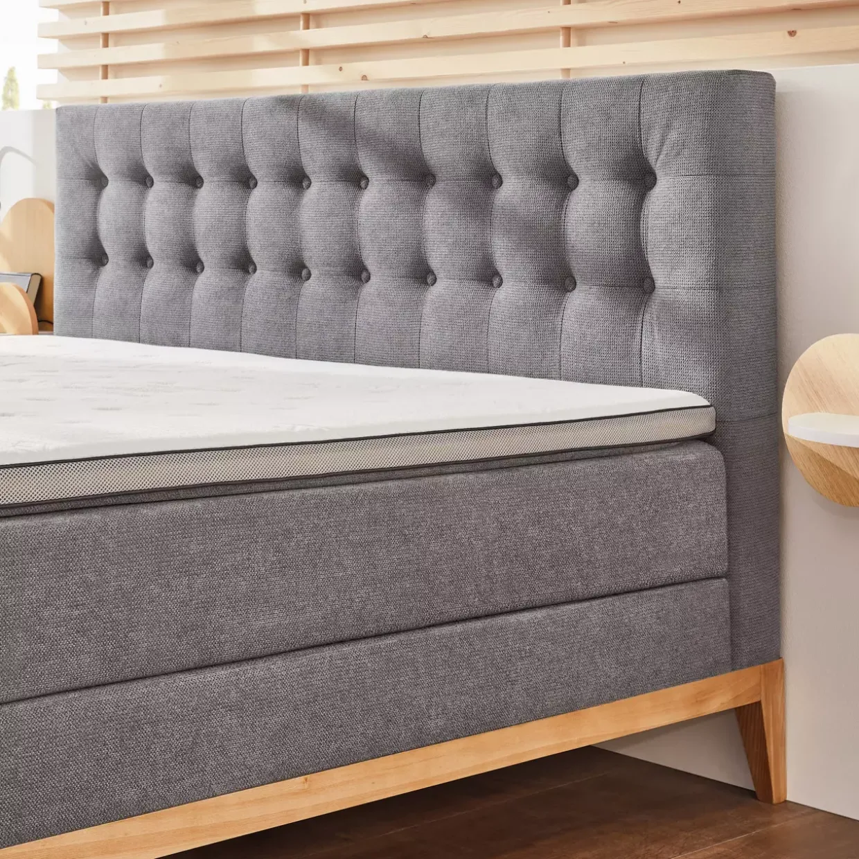 Ein Boxspringbett ist mehr als nur ein Ort zum Schlafen. Es ist ein Rückzugsort, der durch seinen modernen Stil zu jedem Interieur passt. Die graue Farbgebung verleiht dem Raum eine beruhigende Atmosphäre und fügt sich harmonisch in unterschiedliche Raumkonzepte ein. Dank der textilen Oberfläche ist das Bett pflegeleicht und kann einfach gereinigt werden, was besonders in einem modernen Haushalt von Vorteil ist.