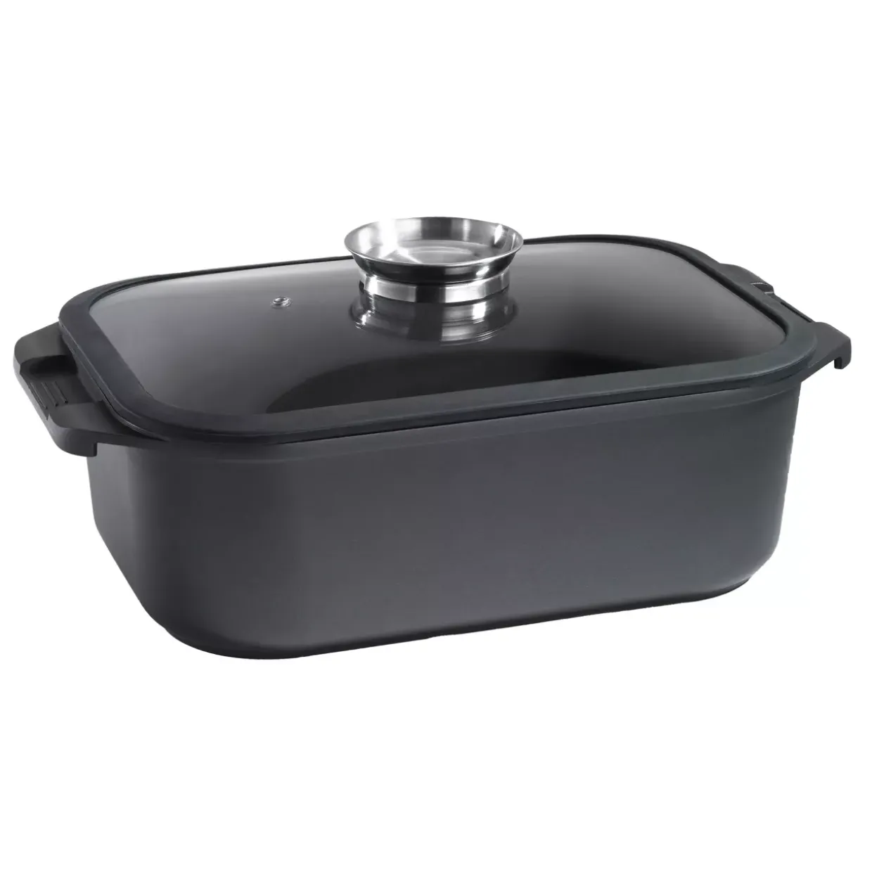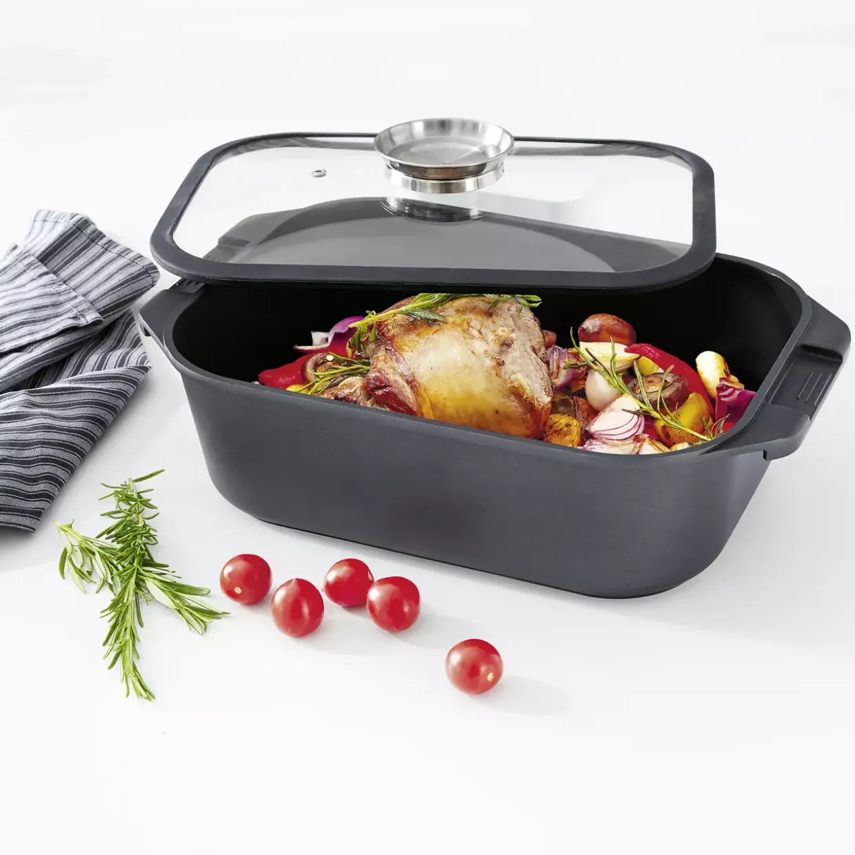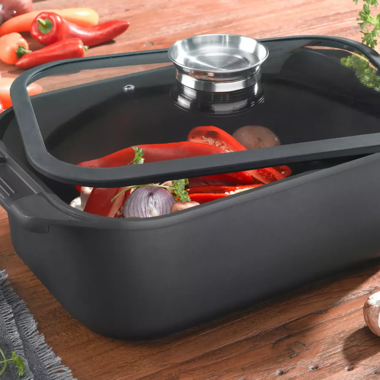 Ein wahres Highlight ist die hohe Temperaturlackierung, die diesen Bräter und Schmortopf zu einem robusten Begleiter in der Küche macht. Gefertigt aus einer Kombination von Glas und Aluminium, vereint er Funktionalität mit einem konventionellen Stil. Diese hochwertigen Materialien sorgen dafür, dass der Bräter nicht nur ansprechend aussieht, sondern auch langlebig und widerstandsfähig gegen die Hitze bleibt.