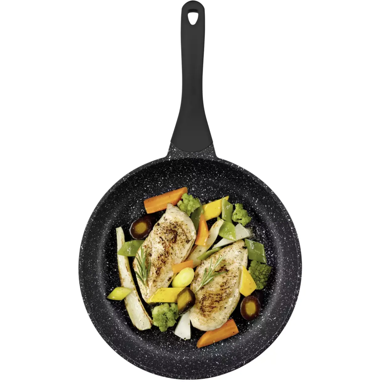 Ein durchgängiger Edelstahlboden hilft dabei, Energie effizient zu nutzen und sorgt für eine gleichmäßige Wärmeverteilung. Die matte schwarze Oberfläche verleiht der Pfanne ein stilvolles und modernes Aussehen, das sich in jede Küche perfekt einfügt.