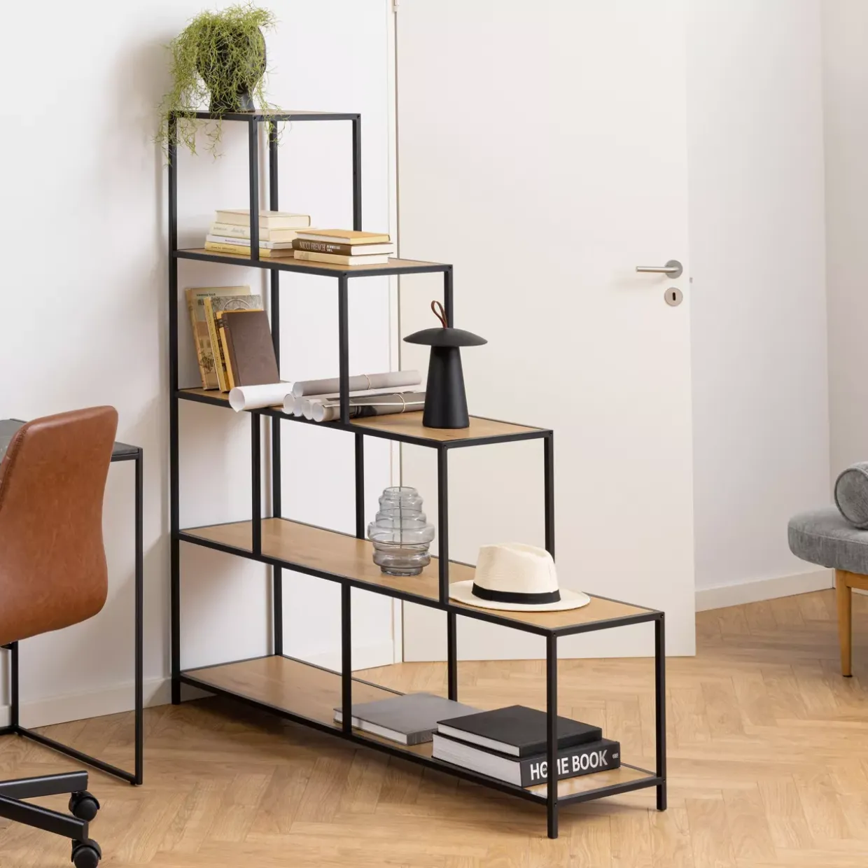 Vier großzügige Regalböden bieten reichlich Platz für Ihre literarischen Schätze, Dekorationen oder persönliche Erinnerungsstücke. Die Materialauswahl aus Holzwerkstoff und Metall sorgt nicht nur für Stabilität, sondern auch für eine ansprechende Optik.