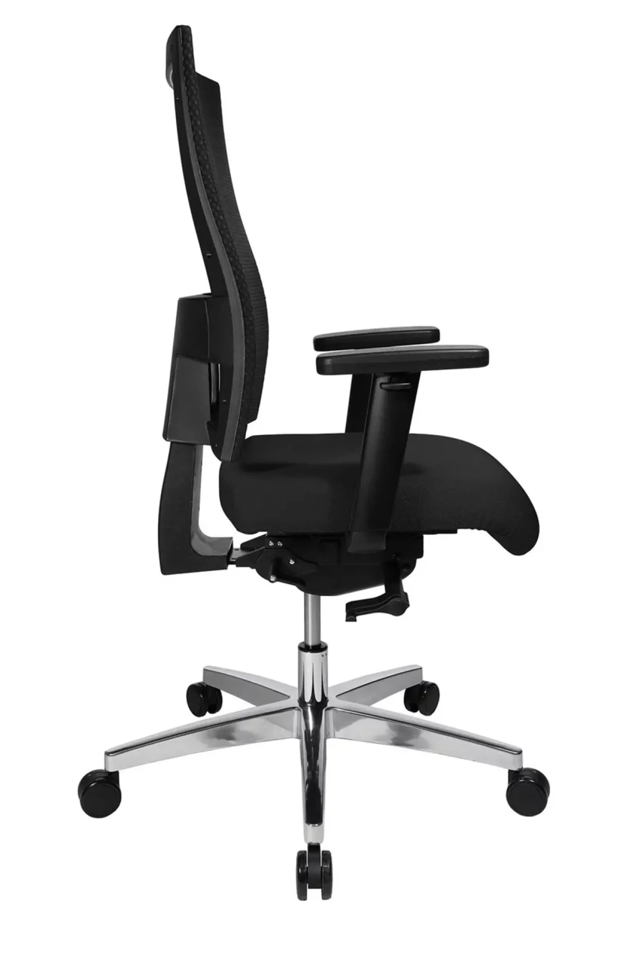 Erleben Sie mit der integrierten Lordosenstütze des Sitness Profi 200 Bürostuhls eine neue Dimension des Sitzkomforts. Die Kombination aus Stoff und Aluminium schafft eine harmonische Verbindung von Eleganz und Funktionalität. Die moderne Farbgebung in Schwarz und Silber verleiht Ihrem Büro eine stilvolle Note.Die Gasdruckfeder ermöglicht eine mühelose Anpassung der Sitzhöhe, während die Synchronmechanik für eine ergonomische Sitzhaltung sorgt. Profitieren Sie von der Flexibilität, die Ihnen die Rollenfußform bietet, um sich frei im Raum zu bewegen. Der aus hochwertigem Polyester gefertigte Bezug verspricht Langlebigkeit und Pflegeleichtigkeit.Für Ihre Gesundheit und Ihren Komfort bietet der Stuhl eine verstellbare Rückenlehne sowie eine Sitztiefen- und Sitzneigeverstellung. Speziell entwickelt für eine tägliche Nutzungsdauer von bis zu 8 Stunden, unterstützt er optimal eine Körpergröße von bis zu 1,98 m. Die Kombination aus ergonomischem Rücken und Body-Balance-Tec-Gelenk fördert eine dynamische Sitzhaltung, die Ermüdung vorbeugt.Genießen Sie die Anpassungsfähigkeit des Sitzhöhenverstellung mit Toplift, um Ihren individuellen Bedürfnissen gerecht zu werden. Der Sitness Profi 200 Bürostuhl vereint modernes Design mit technischen Raffinessen und bietet Ihnen ein komfortables Sitzerlebnis für den Arbeitsalltag.