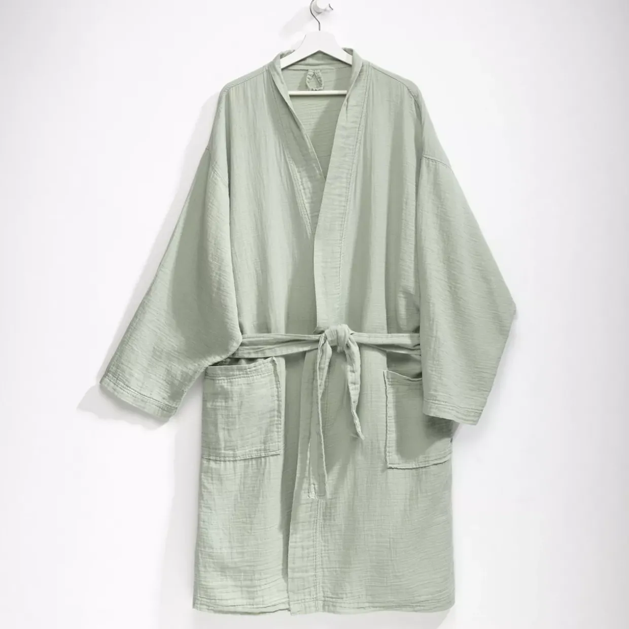 S/M salbei ; 2 lagig; mit Seitentaschen und Bindegürtel;Ein Bademantel aus leichtem Musselin vereint Eleganz mit Komfort. Der moderne Stil in der beruhigenden Farbe Salbei macht ihn zu einem zeitlosen Begleiter, der sich perfekt in jede Jahreszeit einfügt. Gefertigt aus natürlicher Textilfaser, bietet der Musselin-Stoff eine sanfte Haptik, die die Haut umschmeichelt.Dank der Gewebeart Musselin ist der Bademantel leicht und atmungsaktiv, was ihn ideal für den täglichen Gebrauch macht. Die Zertifizierung nach dem Ökotex Standard 100 garantiert Ihnen ein Produkt, das frei von schädlichen Substanzen ist und somit ein Gefühl von Sicherheit vermittelt. Pflegen Sie diesen Bademantel mit Leichtigkeit: Er ist maschinenwaschbar bei bis zu 40°C und kann bei niedriger Temperatur in den Trockner gegeben werden. Auf Bleichen und Bügeln sollten Sie verzichten, um die Qualität des Stoffes zu erhalten. Chemische Reinigung ist nicht erforderlich, was die Pflege besonders unkompliziert macht.Ob nach einem entspannenden Bad oder als gemütlicher Begleiter an faulen Tagen zu Hause – dieser Bademantel bietet Ihnen den Komfort und die Qualität, die Sie verdienen. Eine Investition in Wohlbefinden und Stil, die sich jeden Tag aufs Neue bewährt.