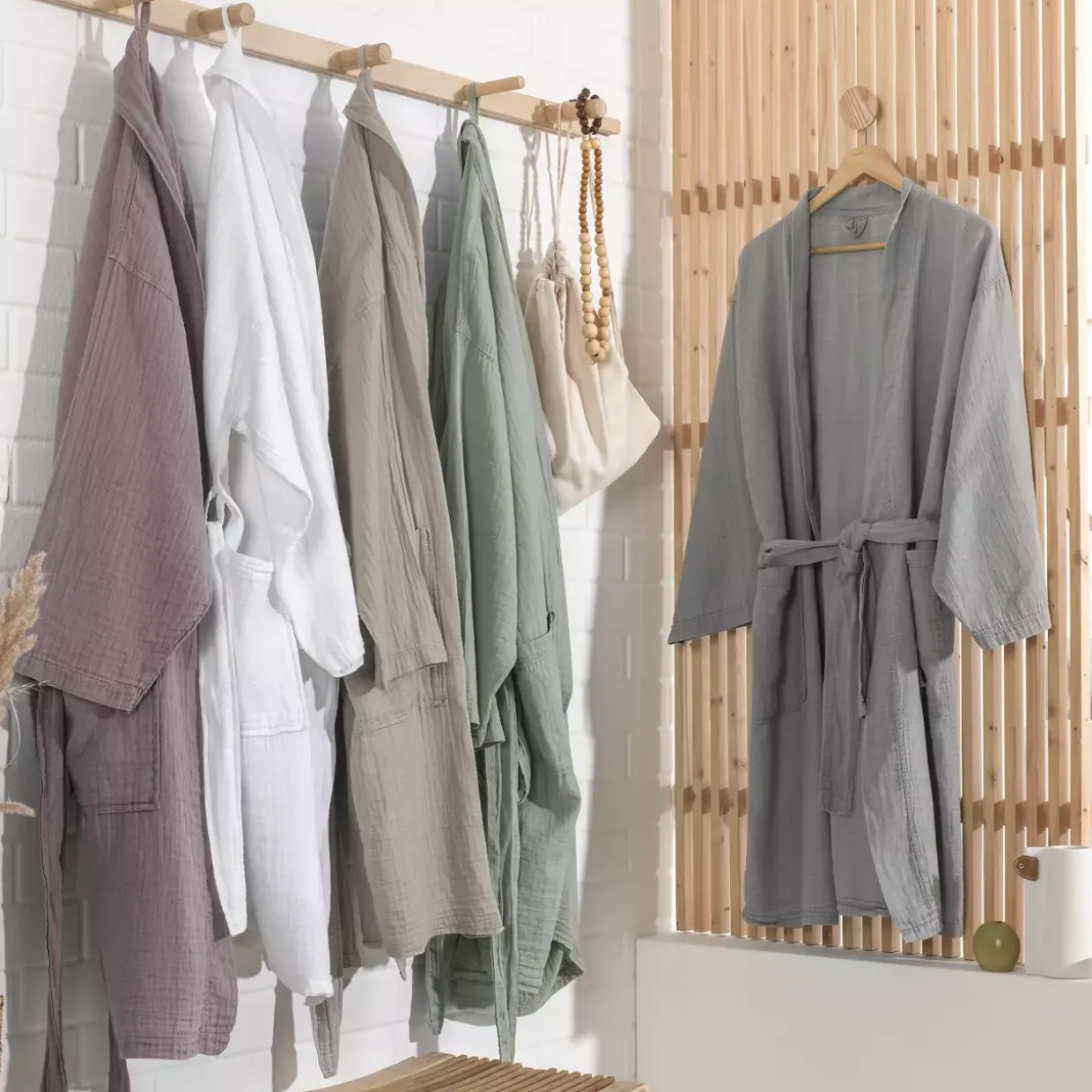 S/M weiß ; 2 lagig; mit Seitentaschen und Bindegürtel;Musselin, ein Gewebe voller Leichtigkeit und Eleganz, verleiht diesem Bademantel seine moderne Note. Das sanfte, natürliche Material aus Textil umhüllt Sie das ganze Jahr über mit einem Hauch von Luxus. Die strahlend weiße Farbe passt sich mühelos jeder Umgebung an und unterstreicht die zeitlose Schönheit des modernen Stils.Für alle, die Wert auf Qualität und Nachhaltigkeit legen, bietet das Ökotex Standard 100 Zertifikat Sicherheit und Vertrauen. Dieser Bademantel vereint Komfort und Umweltbewusstsein auf harmonische Weise. Die Pflege gestaltet sich unkompliziert: Maschinenwäsche bis 40°C erhält die Frische, während der Trockner bei niedriger Temperatur für angenehme Weichheit sorgt. Auf das Bügeln und chemische Reinigungen kann verzichtet werden, was den Alltag erleichtert.Der leichte Musselin Bademantel ist nicht nur ein funktionaler Begleiter, sondern auch ein stilvolles Accessoire, das in keiner Garderobe fehlen sollte. Die Beschaffenheit aus Naturfaser sorgt für ein angenehmes Tragegefühl, das Ihre Haut atmen lässt. Dank der ganzjährigen Eignung ist er zu jeder Jahreszeit ein verlässlicher Partner für entspannte Stunden zu Hause. Entdecken Sie die Verbindung aus Ästhetik und Praktikabilität und lassen Sie sich von der zeitlosen Eleganz des Musselin-Stils inspirieren.