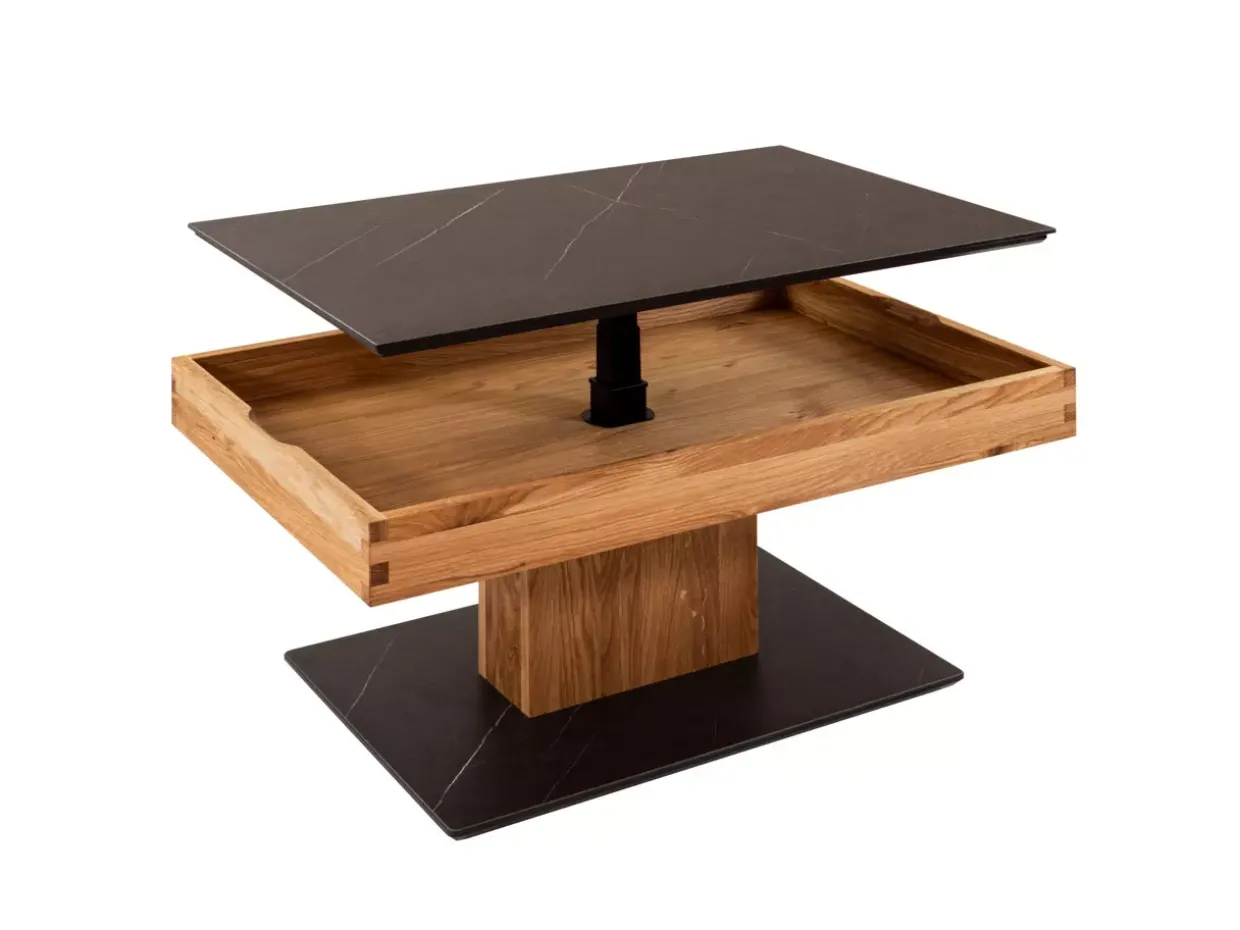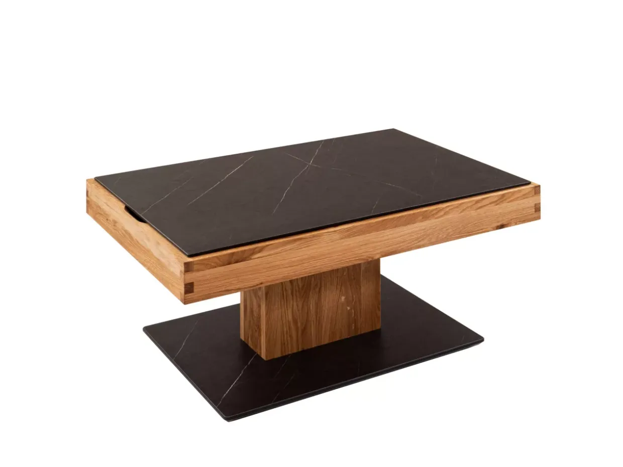 Ein Blickfang in jedem modernen Wohnzimmer: Der rechteckige Couchtisch beeindruckt nicht nur durch seine klaren Linien, sondern auch durch seine exquisite Kombination aus Wildeiche und dem eleganten Marmara Nero. Mit seiner geölten Oberfläche strahlt der Tisch eine natürliche Wärme aus, die einladend wirkt und zugleich eine hochwertige Verarbeitung unterstreicht.