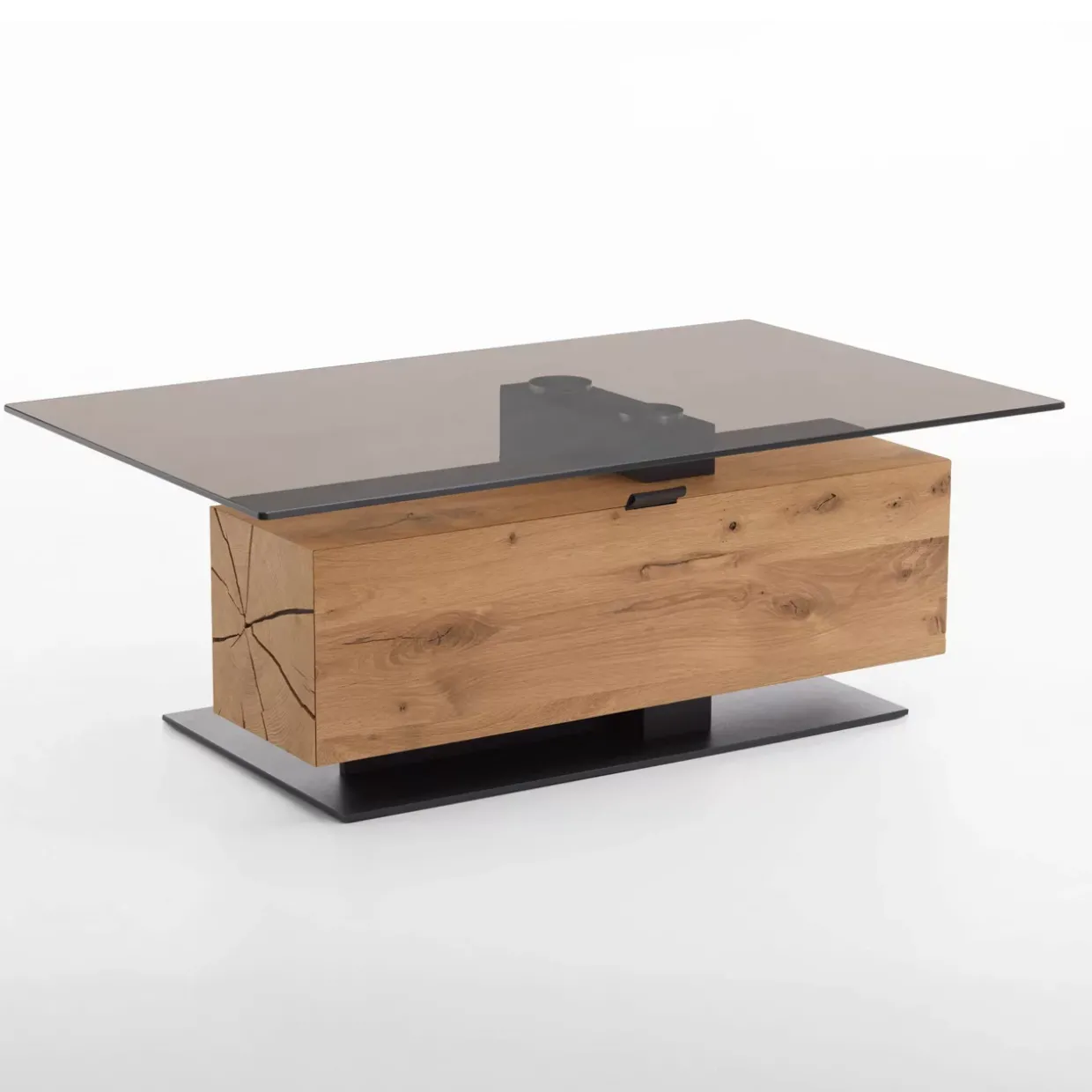 Mit seiner anthrazitfarbenen Holzplatte und dem Hirnholzblock aus Kerneiche Umato, der sorgfältig gebürstet wurde, bietet dieser Couchtisch eine robuste und zugleich ansprechende Oberfläche. Das Parsol-bronzefarbene Glas, gehärtet nach den neuesten Standards (ESG), sorgt nicht nur für ein stilvolles Erscheinungsbild, sondern auch für Sicherheit und Langlebigkeit.