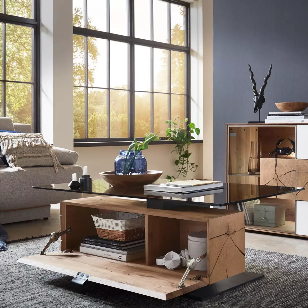 Besonders hervorzuheben ist das Zusammenspiel der Materialien. Die Wärme des Holzes trifft auf die kühle Eleganz des Glases und schafft so ein harmonisches Gleichgewicht. Dieser Couchtisch ist nicht nur ein funktionales Möbelstück, sondern auch ein Statement, das in jedem Raum Akzente setzt.