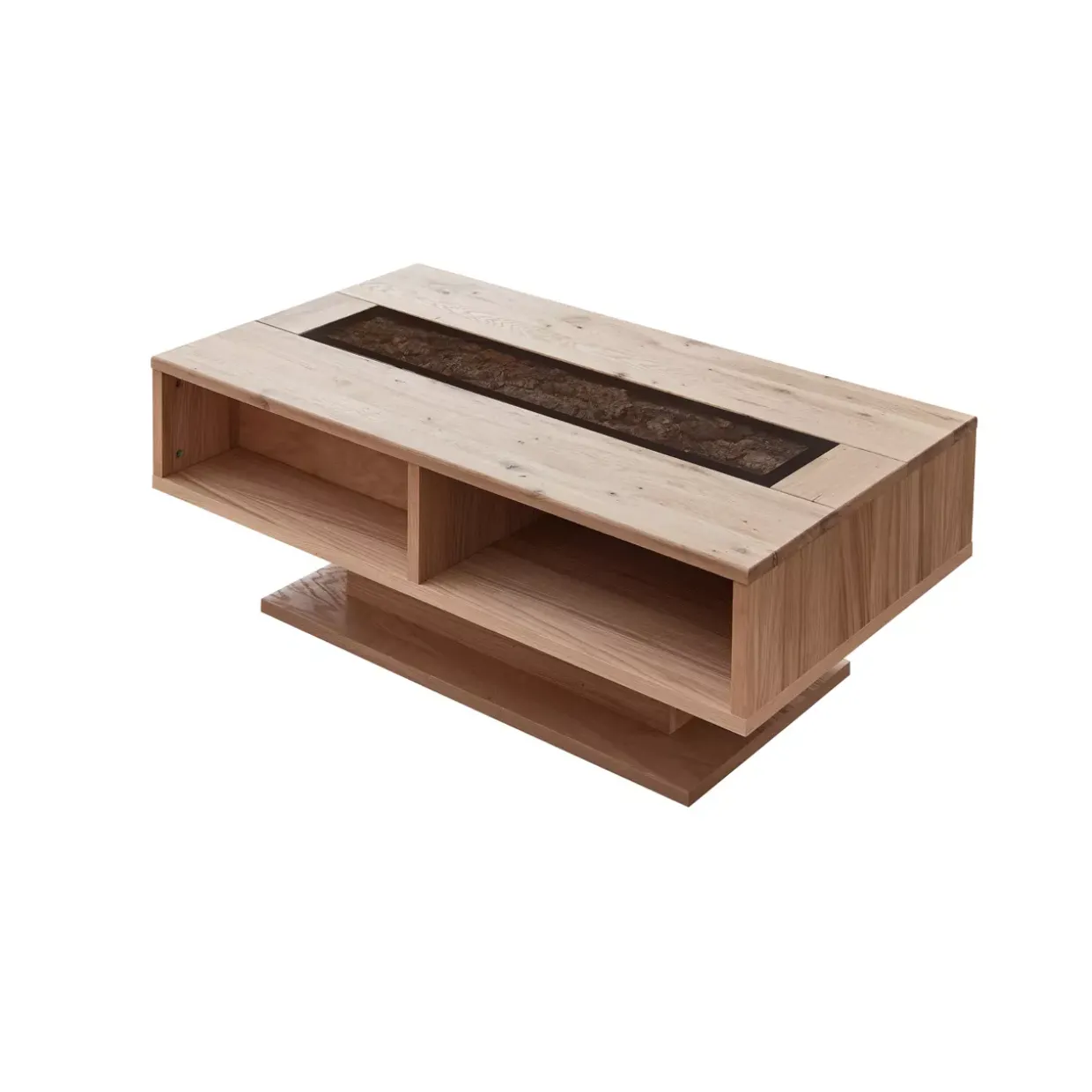 Massivholz sorgt für Stabilität und Langlebigkeit, während das Wildeichefurnier den natürlichen Charme dieses Möbelstücks betont. Durch die Verwendung von hochwertigen Materialien strahlt der Tisch eine warme, einladende Aura aus, die Ihr Wohnzimmer zu einem gemütlichen Rückzugsort macht. Die gerundeten Absetzungen aus Echtkork sind ein weiteres Highlight, das den Tisch zu etwas Besonderem macht und ihm eine moderne Note verleiht.