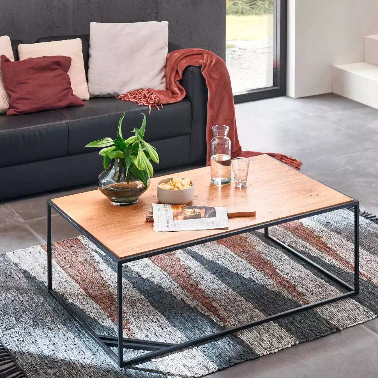 Der Kalia Couchtisch besteht aus einer gelungenen Verbindung von Metall und Holzwerkstoff, was ihm Stabilität und eine edle Optik verleiht. Die flache Rohrform der Tischbeine unterstreicht das moderne Design und sorgt gleichzeitig für einen soliden Stand. Die furnierte Oberfläche des Tisches bietet eine angenehme Haptik und lässt die Holzstruktur besonders schön zur Geltung kommen.